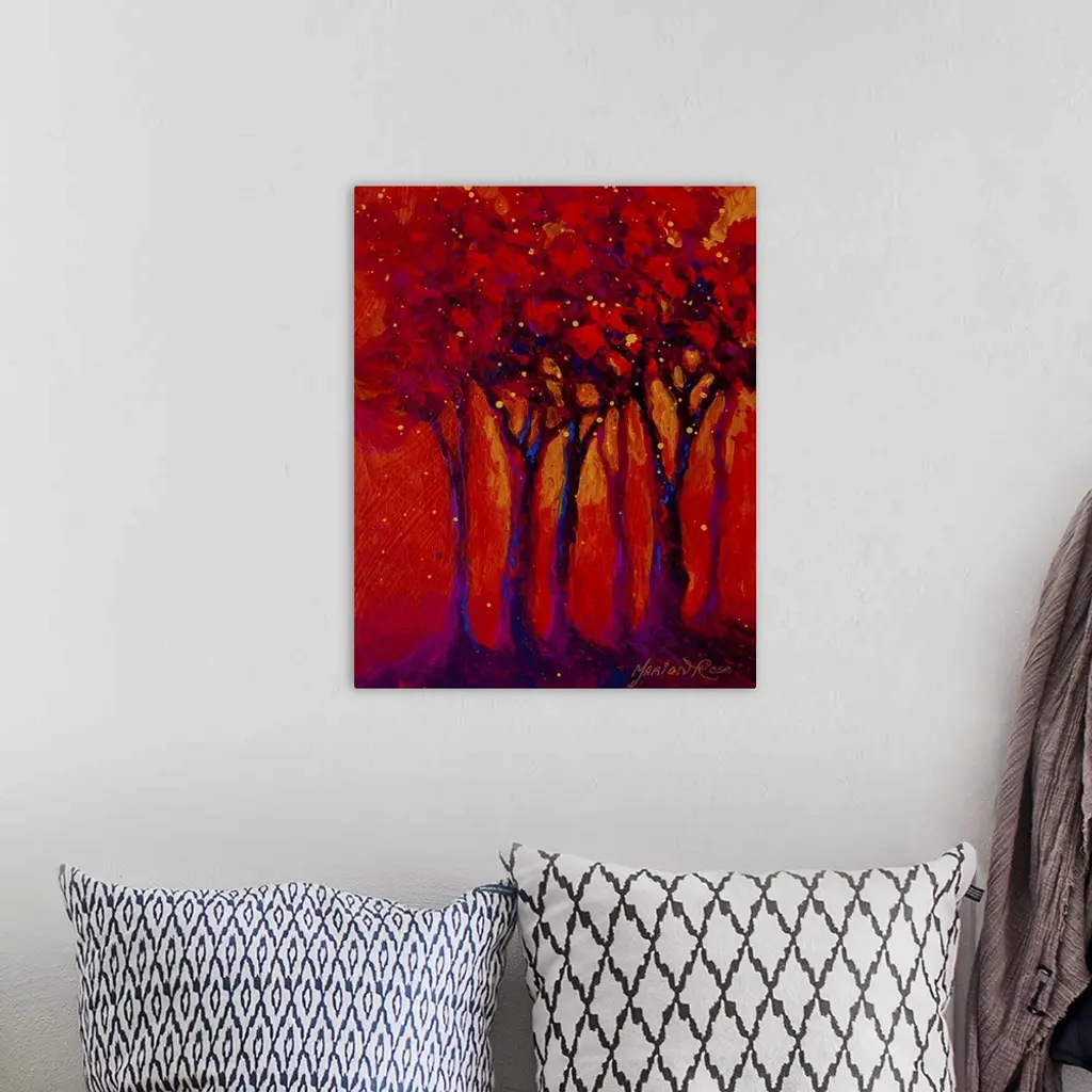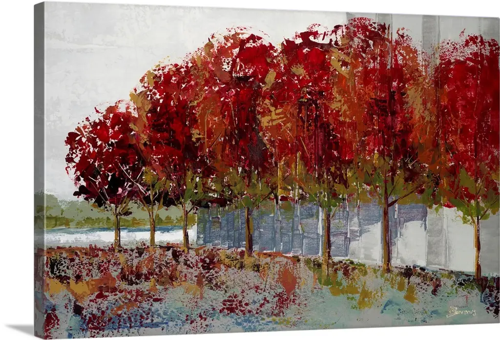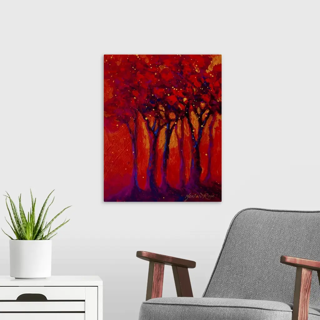 Contemporary abstract painting of tree silhouettes with brightly covered dots and circles.