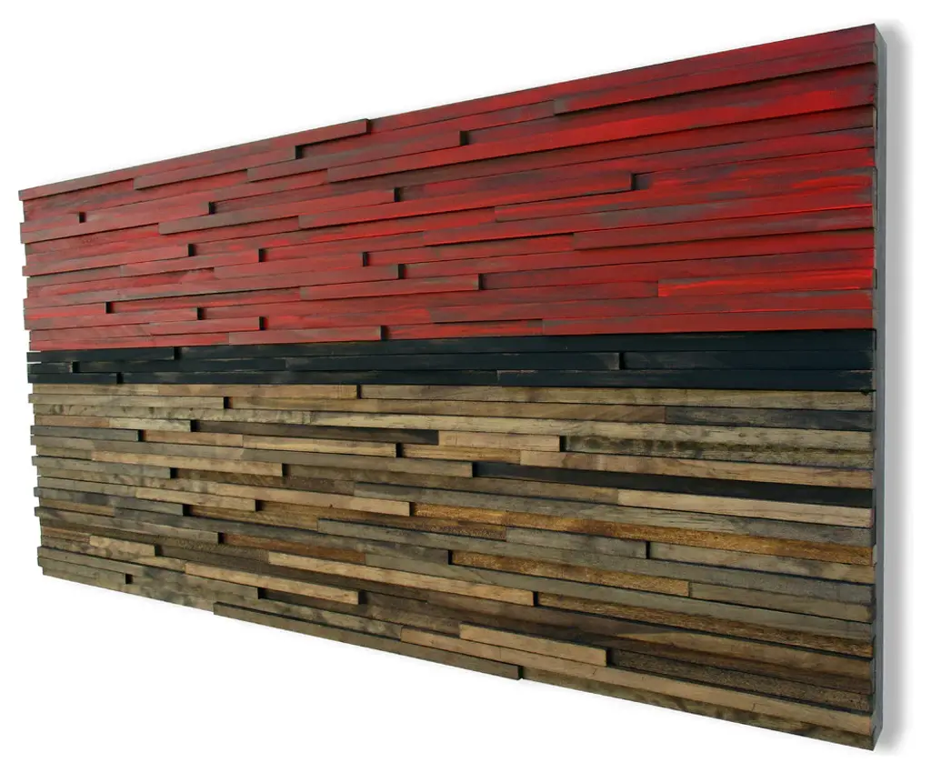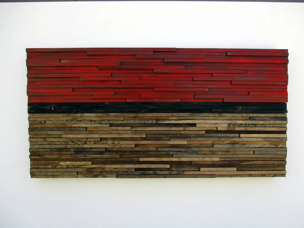 This abstract landscape art piece is made from hundreds of tiny pieces of wood that have been placed and adhered onto a handmade wooden frame canvas. The painting technique on the top portion is a slightly distressed look with red on black. Makes for both a modern rustic look.MADE TO ORDER• Size: 20" high x 40" wide x 2" deep• Made-to-order. Will be recreated to look similar.• Comes with a metal cleat for easy mounting.