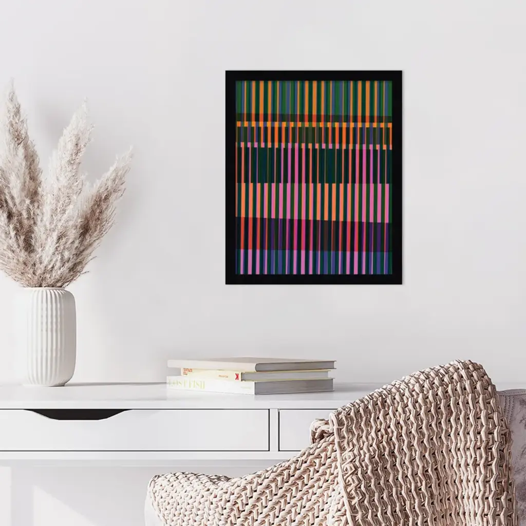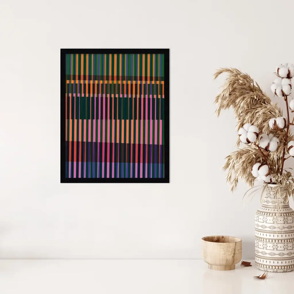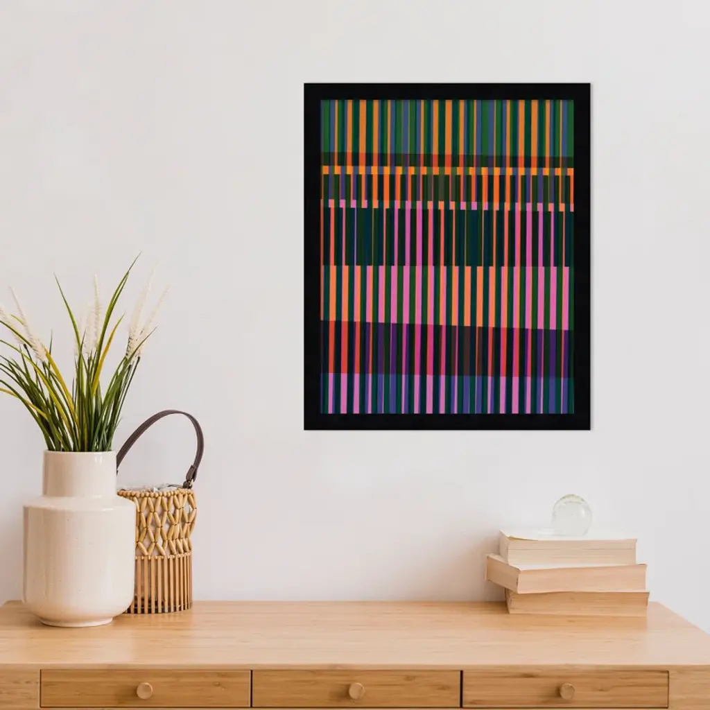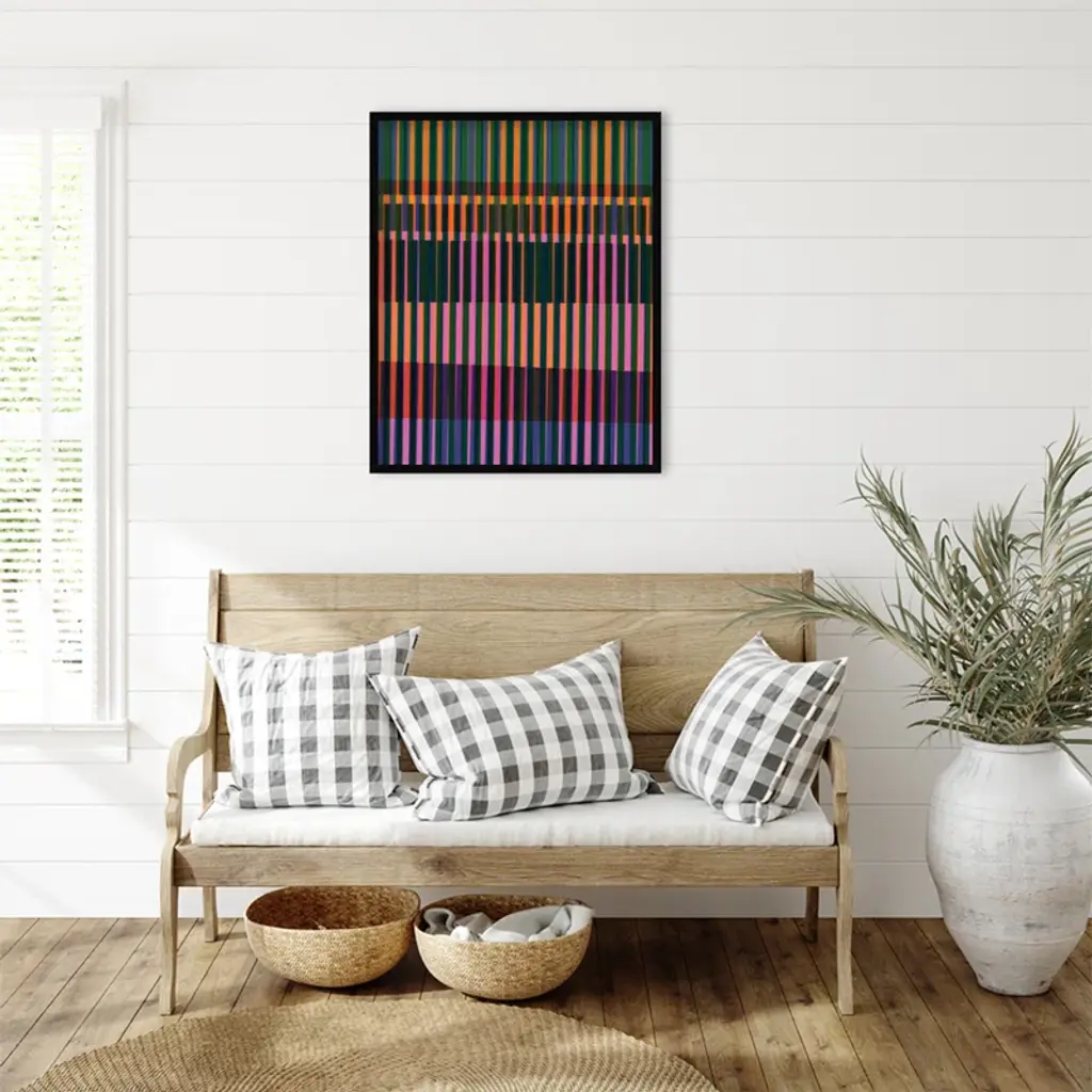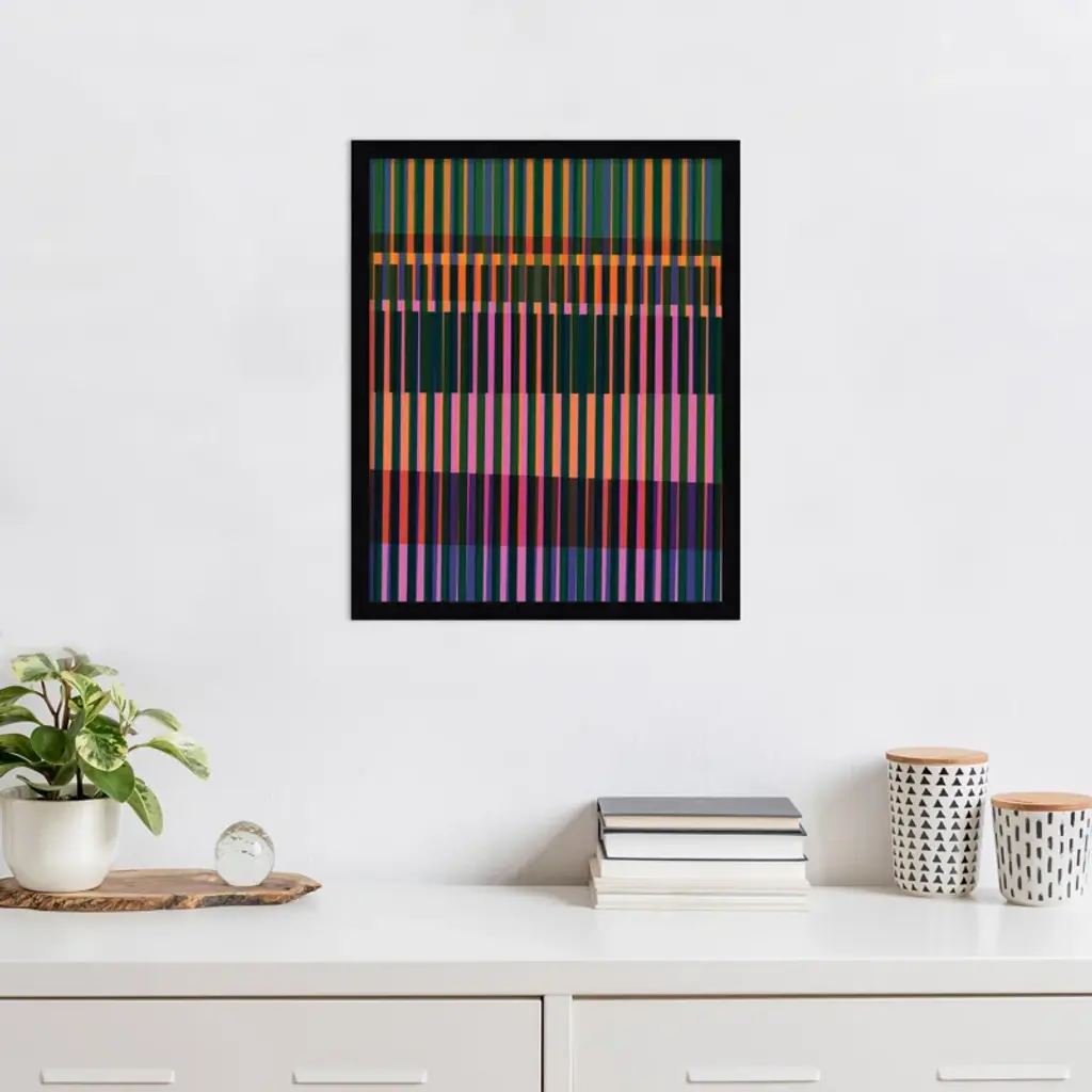 Art description: This piece is a visually captivating artwork that explores the concept of pattern through abstract and geometric forms. The artist skillfully combines various lines and blocky shapes to create a mesmerizing composition that engages the viewer's imagination. This framed art print was created by Beth Vassalo and printed in Madison, WI. The print is giclee printed using fade-resistant inks for picture-perfect detail and incredible depth of color and finished with a 100% real wood frame. Individually made using traditional custom framing techniques, it has the quality you would expect from your local frame shop. Features: Custom artwork details: Abstract lines 17 by Beth Vassalo. Artis bio: Beth Vassalo is an artist and photographer, specializing in geometric and abstract designs. She is inspired by shapes, bold colors, and a minimalist aesthetic. She lives in Washington, DC with her husband and three daughters. 100% Real wood frame details: The art is framed in the frame. Quality and authenticity: Prints are giclee printed using fade-resistant inks for picture-perfect detail and incredible depth of color. They are protected with a shatterproof sheet of gallery-quality acrylic, which resists UV rays and light damage better than traditional glass. The artwork is authentically licensed. Protective backing: Premium paper prints are permanently adhered to a rigid backer board to prevent rippling over time. Hassle-free hanging: Ready to hang for easy installation. All framed prints have a durable hanging wire attached to the back and a hanging hook and nail. Assembled in the USA: Each piece is assembled to order in Madison, WI USA. For home or commercial use: Because of our attention to detail and focus on artistry, architects, interior designers, and homeowners alike choose this framed art print to create beautiful living spaces.