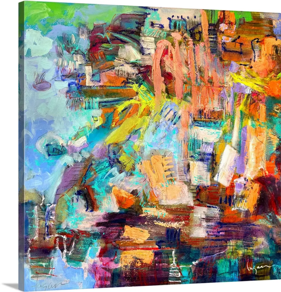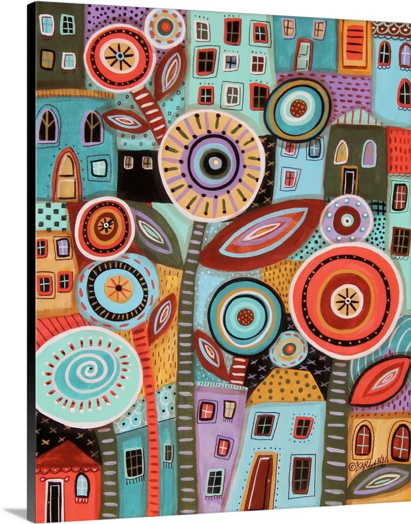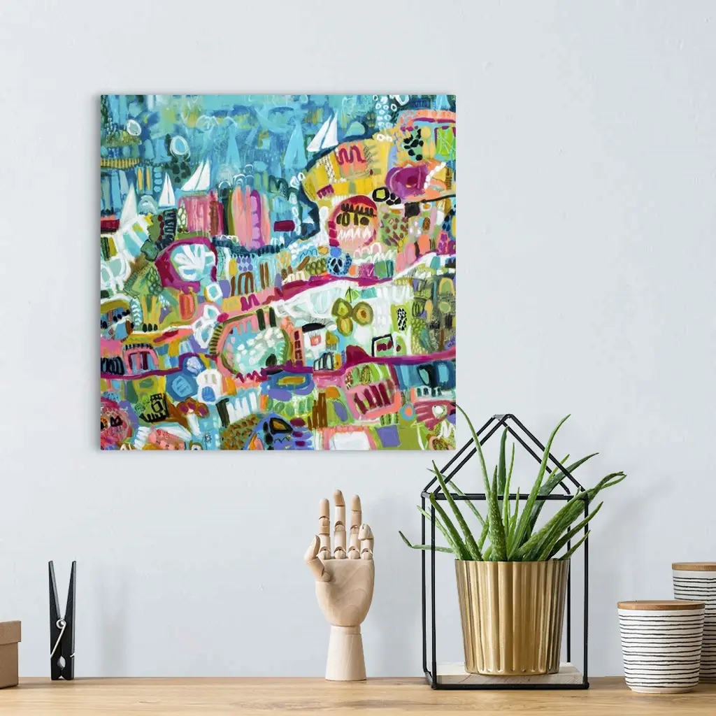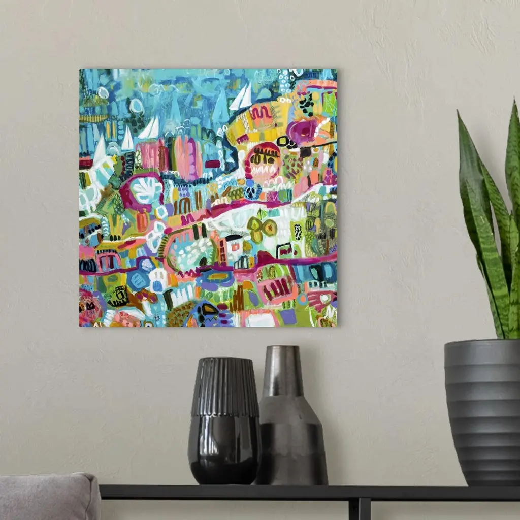 Contemporary artwork of an aerial view of a beachside town and ocean with sailboats in the water.