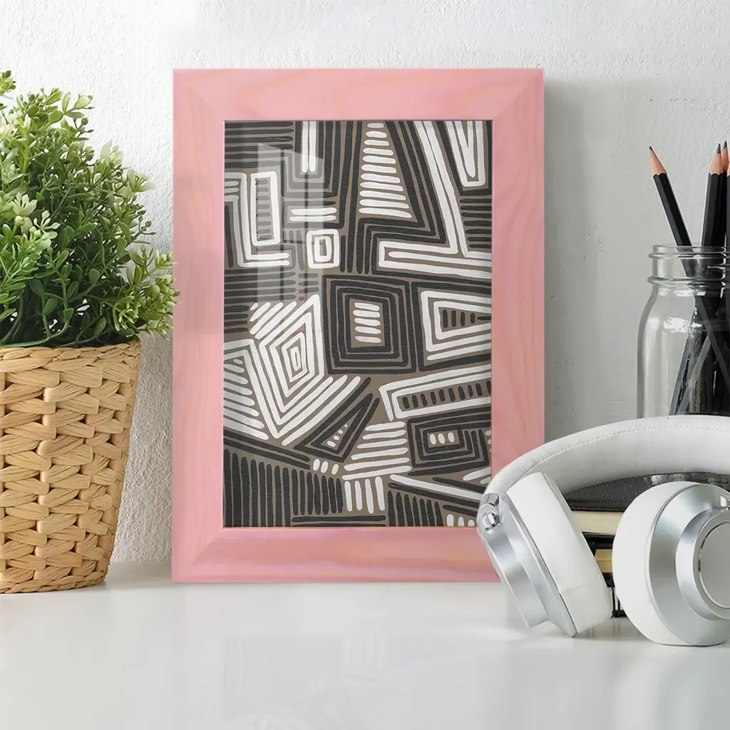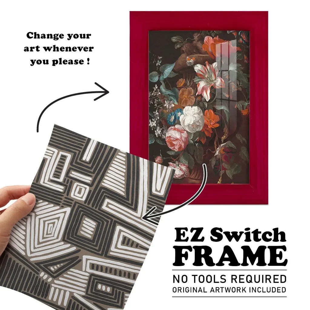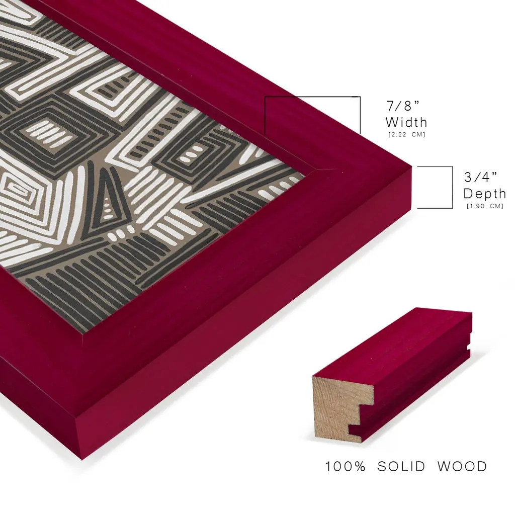 Abstract Maze II -EZ SWITCH Framed Print w/glass-Cherry Red A delightful, framed print. Featuring a solid wood frame with real wood glass. This premium print is giclee quality. In addition, every frame features a removable back and table top stand. This allows you to change your art in the future or to just stand the art on a table for a new look. We are sure you'll enjoy our new series of EZ SWITCH Framed Art. Solid Wood Frame Real Glass Removable / Replaceable Art Built in Tabletop Stand Sizes range from 4x6 up to 12x15 - buy just one or pair them up as sets as you see fit.