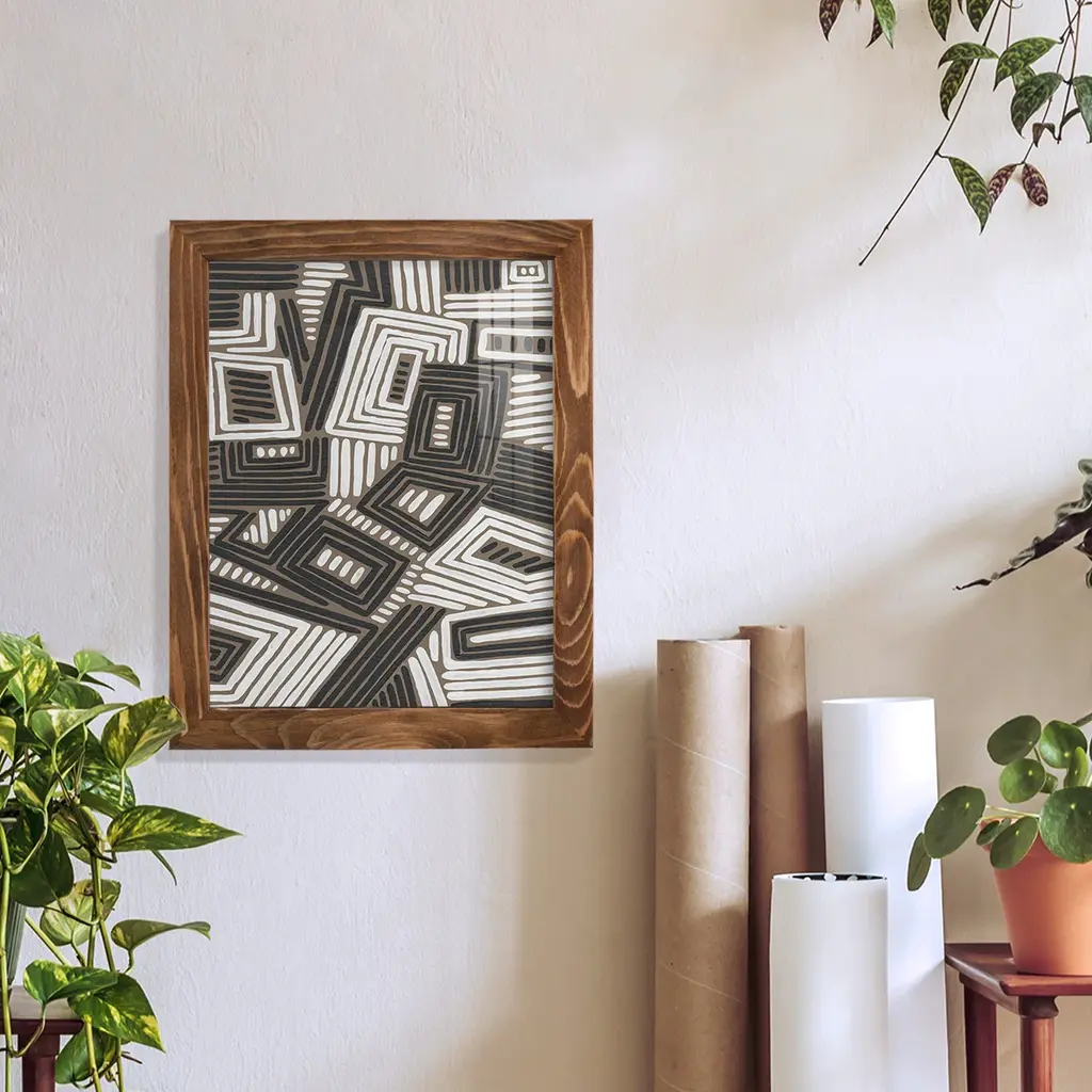 Abstract Maze IV -EZ SWITCH Framed Print w/glass-Cherry Red A delightful, framed print. Featuring a solid wood frame with real wood glass. This premium print is giclee quality. In addition, every frame features a removable back and table top stand. This allows you to change your art in the future or to just stand the art on a table for a new look. We are sure you'll enjoy our new series of EZ SWITCH Framed Art. Solid Wood Frame Real Glass Removable / Replaceable Art Built in Tabletop Stand Sizes range from 4x6 up to 12x15 - buy just one or pair them up as sets as you see fit.