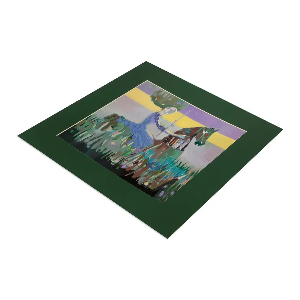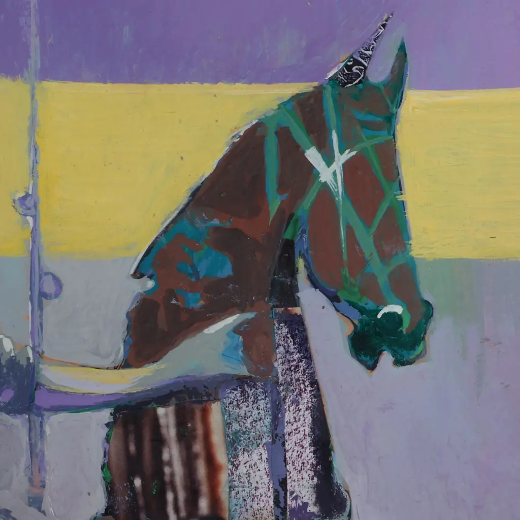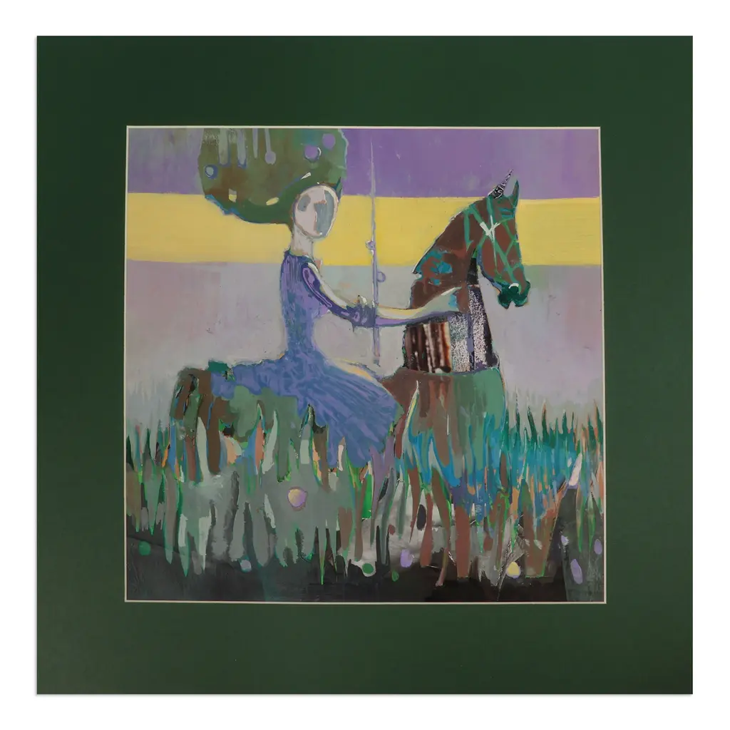 Vahagn Ghazaryan's mixed media painting on paper draws you into a surreal dreamscape of color and movement. A featureless figure sits atop a horse, their forms rendered in shades of lavender, moss green and indigo that drift between solid and spectral. The horse, marked by green, crisscrossing lines, hints at a mythical creature while the twilight-hued background—bands of warm yellow and soft lavender—envelops the scene in a quiet, otherworldly glow. Rooted in Armenian folklore, this artwork suggests mysterious and unseen journeys, embodying themes of adventure in the soft blur between fantasy and reality.