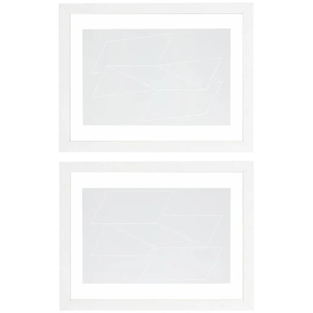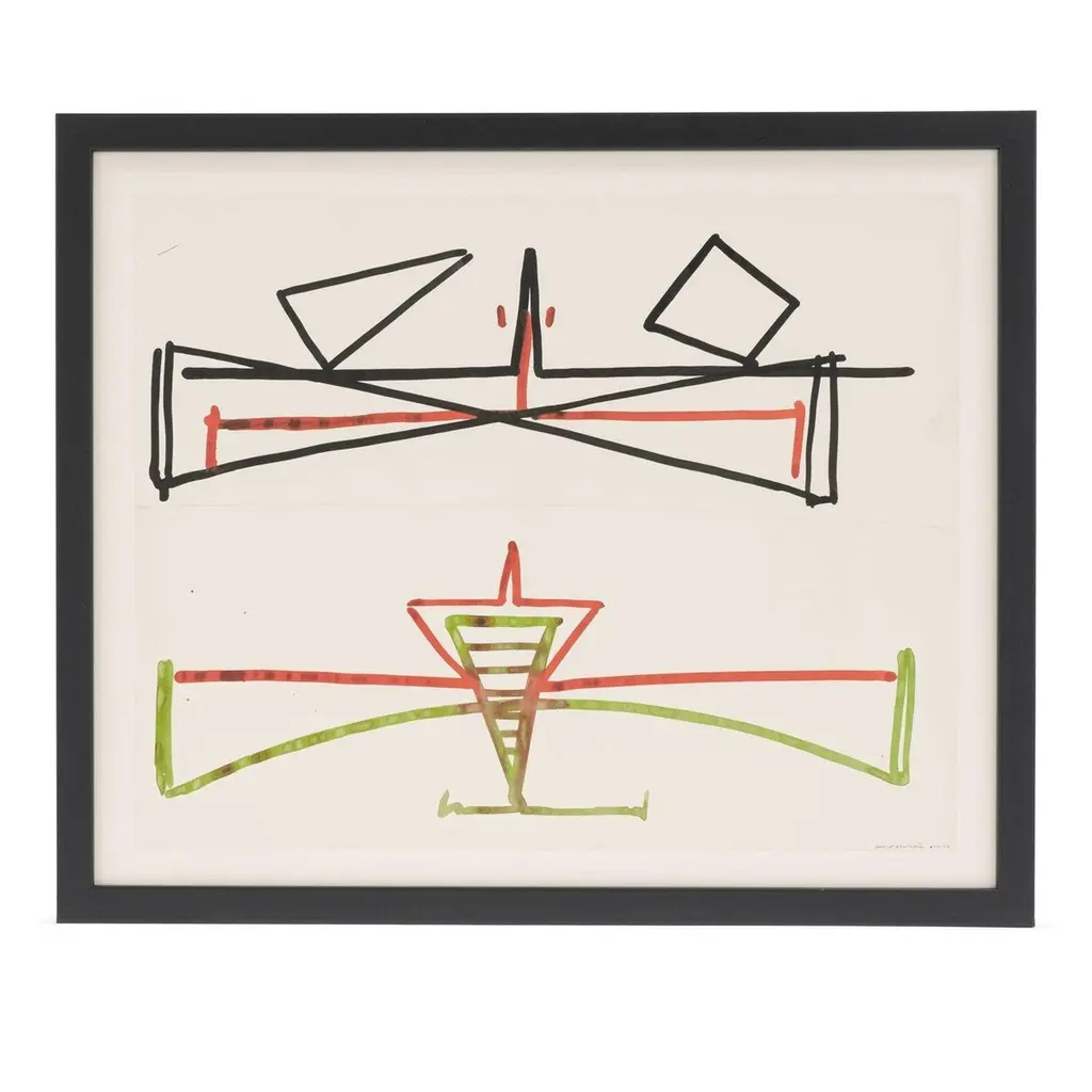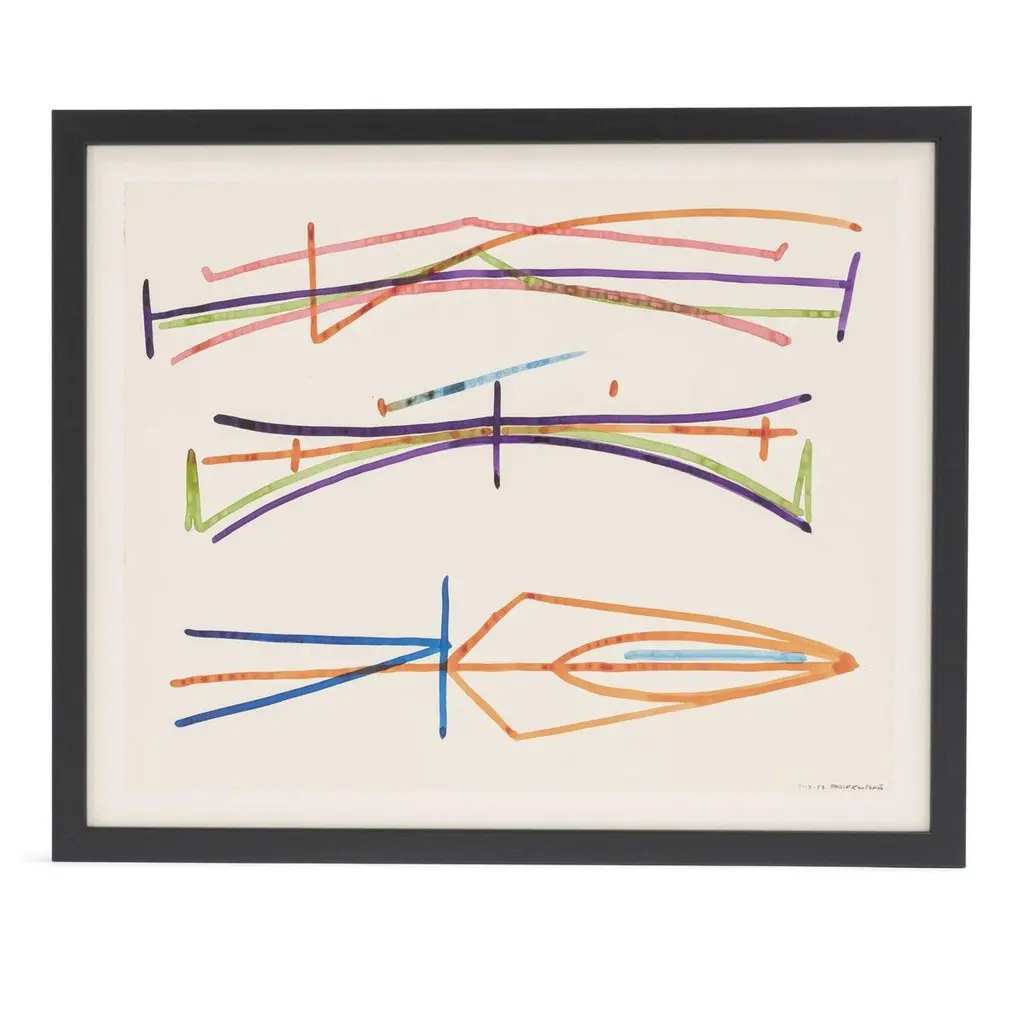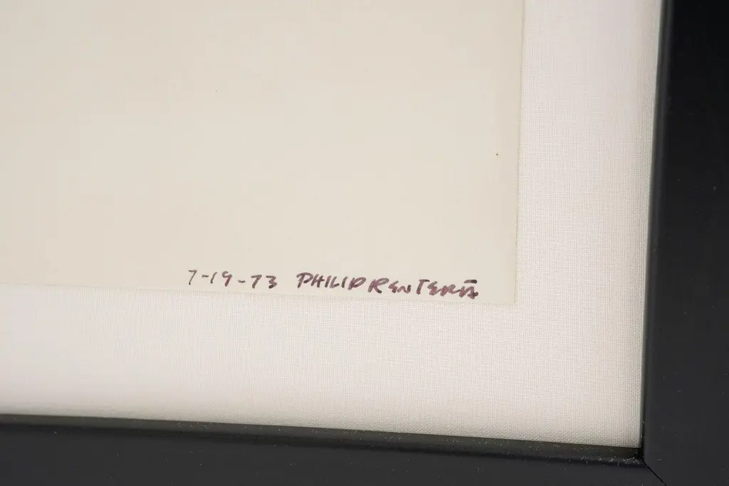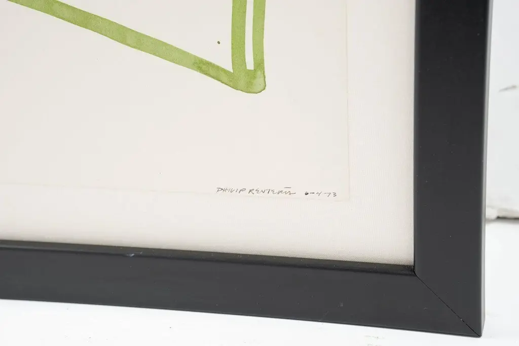 Abstract mixed medium-on-paper by Philip Renteria (1947-1998), 1973. Untitled gouache and ink on paper, both dated and hand-signed by artist. Newly-framed, float-mounted within black metal frame over a linen backing. Two paintings available. Sold individually priced $2,800 each.