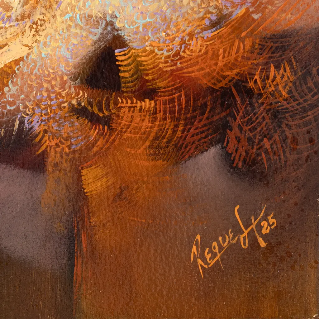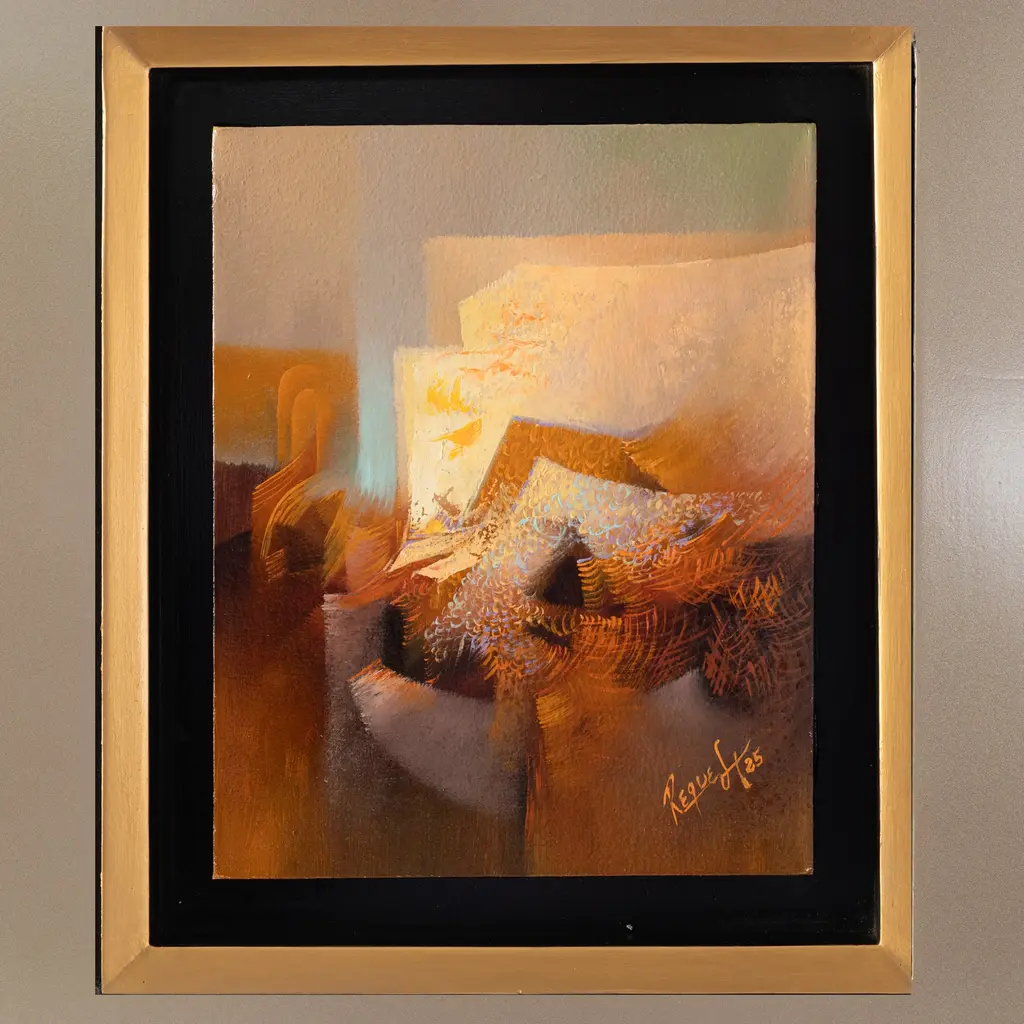 In the realm where abstraction meets imagination, every brushstroke becomes an invitation to see beyond the visible. Peruvian artist Teodoro Reque Liza works in oil using an abstract style to capture forms that reimagine visual space, with evocative elements that invite the viewer to unleash their imagination. This modern painting is presented in a champagne-toned wooden frame—a refined color that, alongside the artist's carefully chosen palette, bestows upon the composition a sense of subtlety and timeless elegance.Titled Formas y Luces in Spanish.