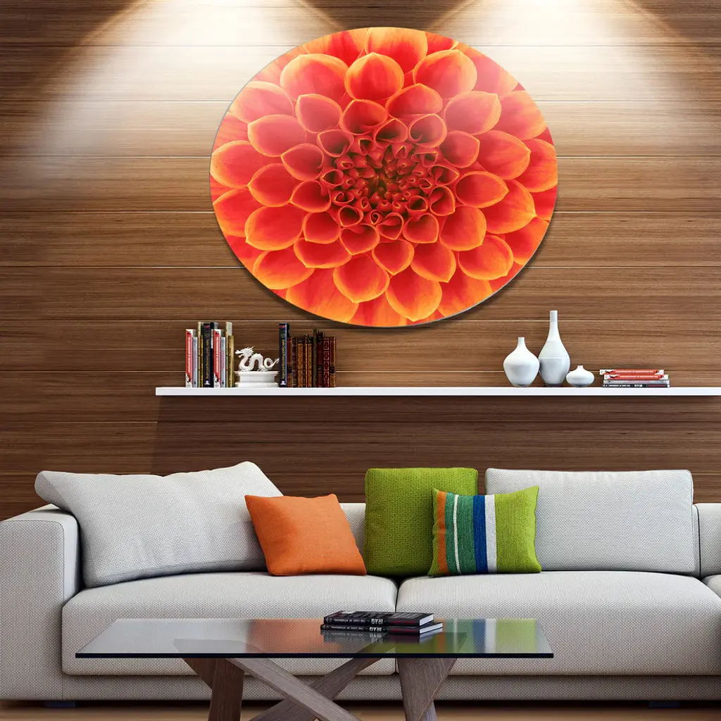 Bring Contemporary Abstraction to your home with this large Circle Metal wall art. This Abstract Orange Flower Design Metal Artwork makes it the focal point of any room or office. - White Gloss Coating ensures colors are extra vibrant with light reflection.- Aluminum grade Sheet Metal with 1 inch mounting frame on the back giving the illusion that the artwork is floating on the wall..- Mounting Brackets are included along with instructions.- High Quality Digital images are created directly into a glossy aluminum panel producing a stunning and captivating print into the glossy finish of the metal.- Water, Fire and Scratch resistant HD Aluminum panels.- Looks better than any photo paper and guaranteed to last at least 20 years- Easy to clean with a microfiber cloth. Colors are far superior to regular Canvas Art. - Easy to Hang