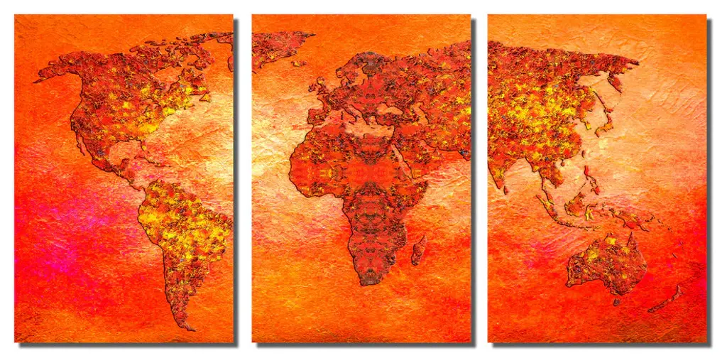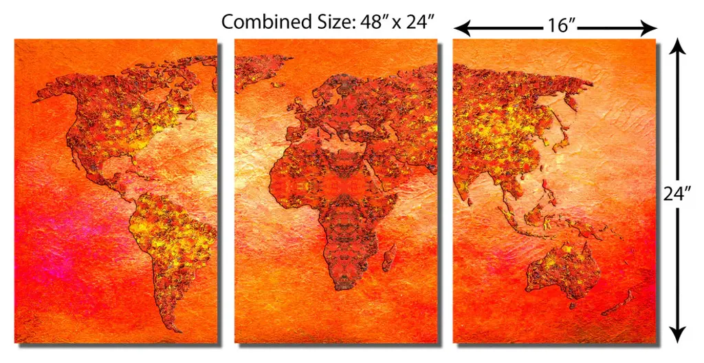 60"œ x 30"œ total size. Ready To Hang! (3 pieces - 20"œ x 30"œ each). 3 Panel Split (Triptych) Abstract orange-red World Map Metal Print. Modern metal wall art for home or office wall decor & interior design. Printed on Luxurious, HD aluminum glossy metal panels. Multi panel art.. HD aluminum panels. Metal print wall art. Includes Shadow Wall Mount on the back.• Aluminum Metal Wall Art• Made in USA• Ready to hang - No assembly required• Shadow mount hardware on the back• 0.045"œ thick HD Aluminum Panels• Scratch resistant, glossy finish• Superb color clarity, luxurious prints• Epson printing process• For indoor or moisture rich environment use• Easy to clean. Gently wipe with microfiber cloth.