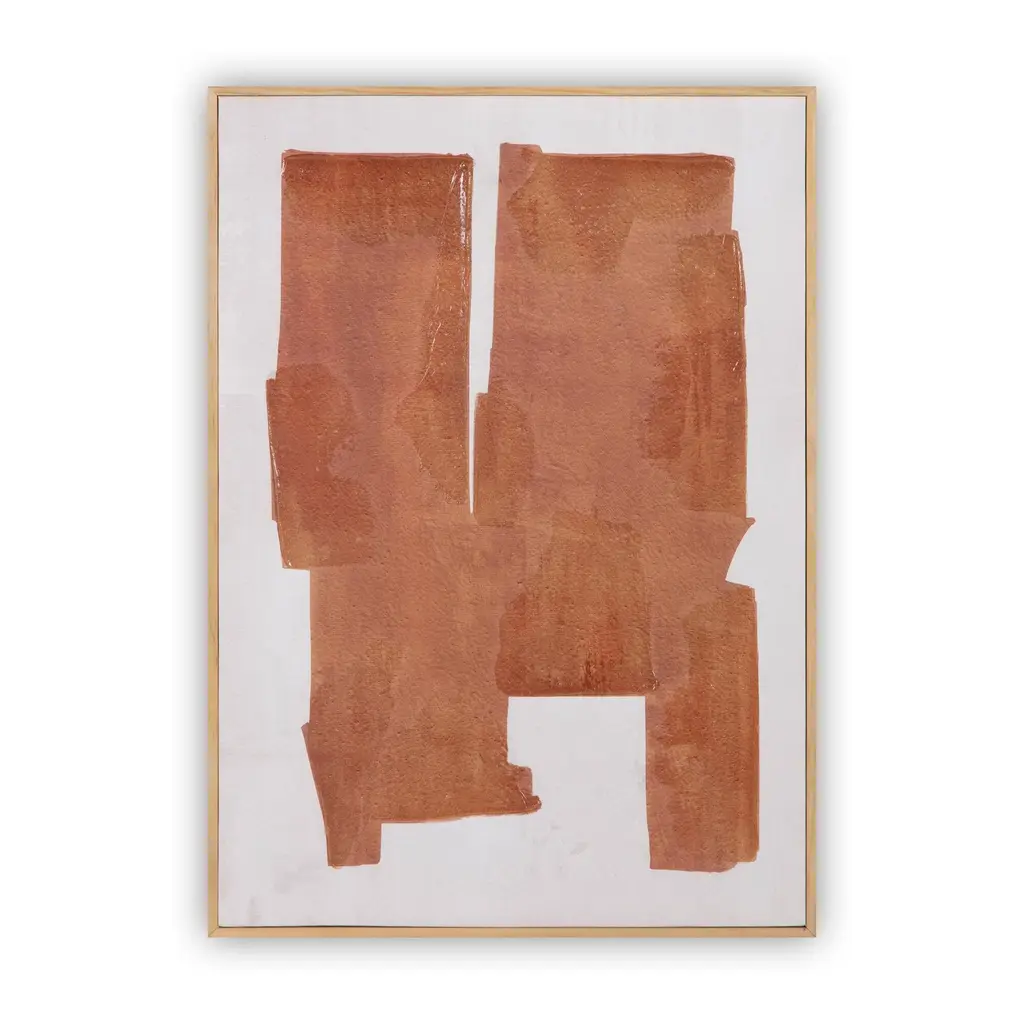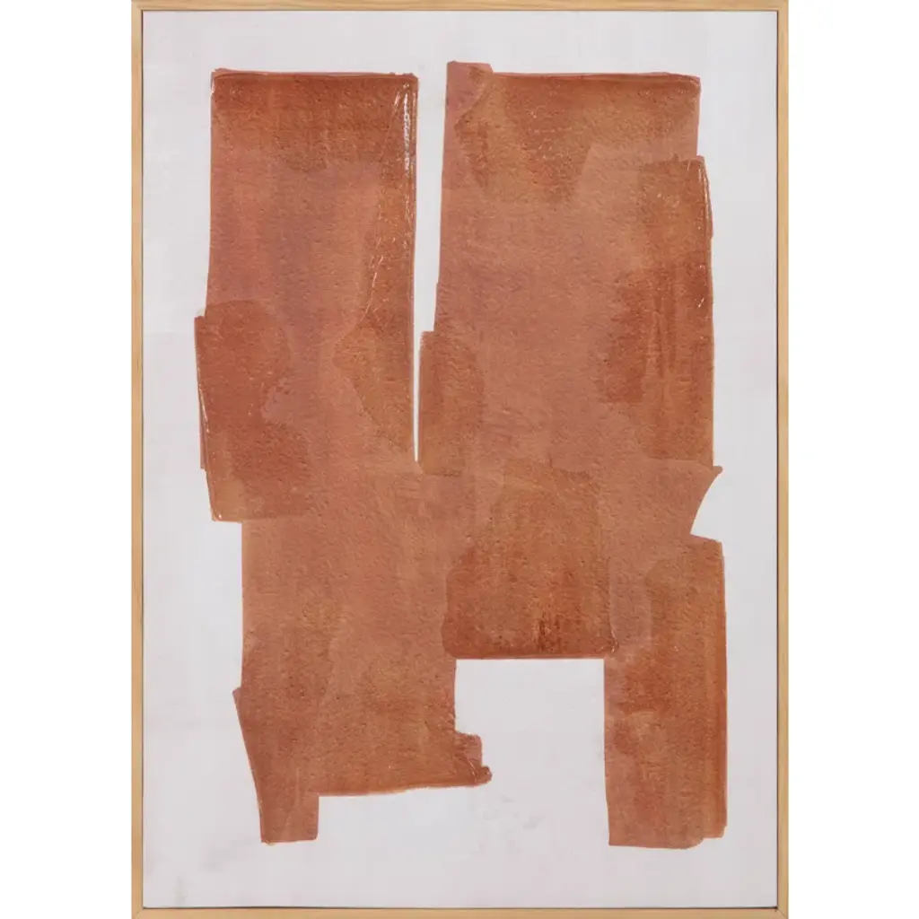 A painting with an abundance of abstract allure where sharp angles are elegantly softened by muted tones, Cici's complementing pink and orange hues evoke an earthy warmth, creating a serene yet striking composition—a captivating piece expertly finished with a solid pine frame.