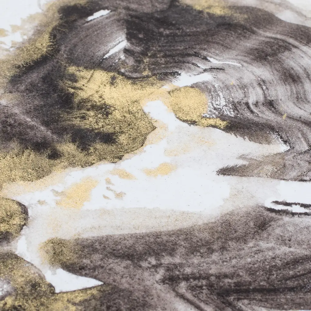 "The Infinity Series comes from an investigation that started in 2020. Seeing what the world was experiencing at the beginning of the COVID-19 pandemic made me reflect on health problems I've had my whole life as a result of a traffic accident. From uncertainty and pain then comes rebirth and a shift in the way of seeing life and understanding that it is just an instant and that only the present counts," says Costa Rican artist Magda Cordoba of her collection of abstract paintings crafted with natural mineral pigments and watercolor on paper. This painting in black, grey and gold is part of this series and features a cardboard mat and a foamboard base.Titled Serie Infinity 5 in Spanish.