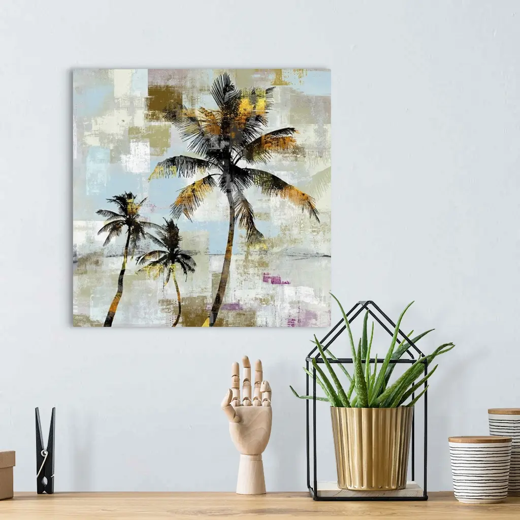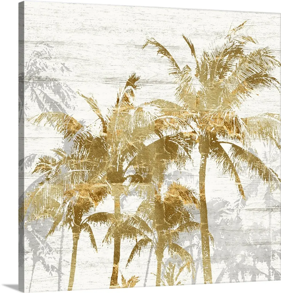 Artistic artwork of a group of black palm trees with gold accents and a background of varies colored patches.