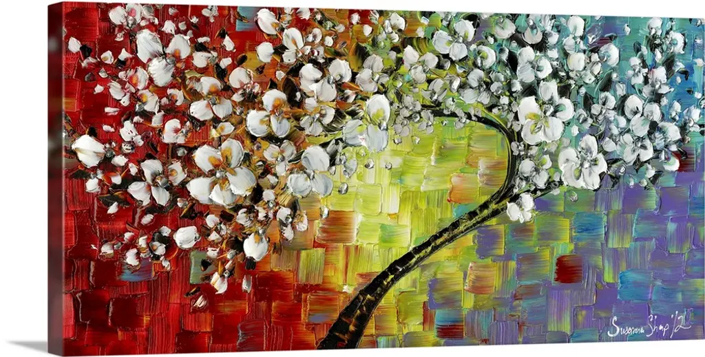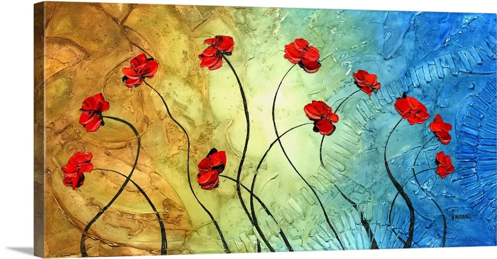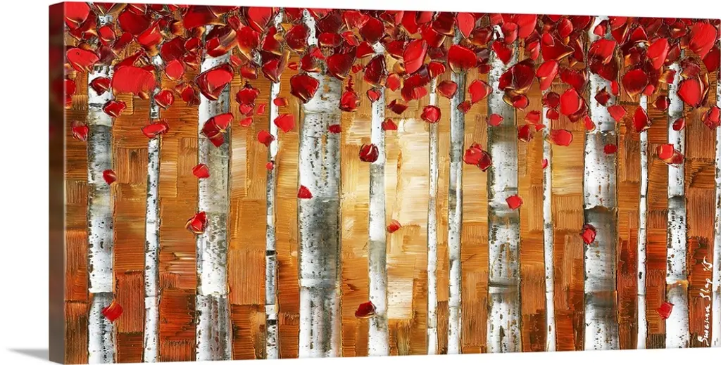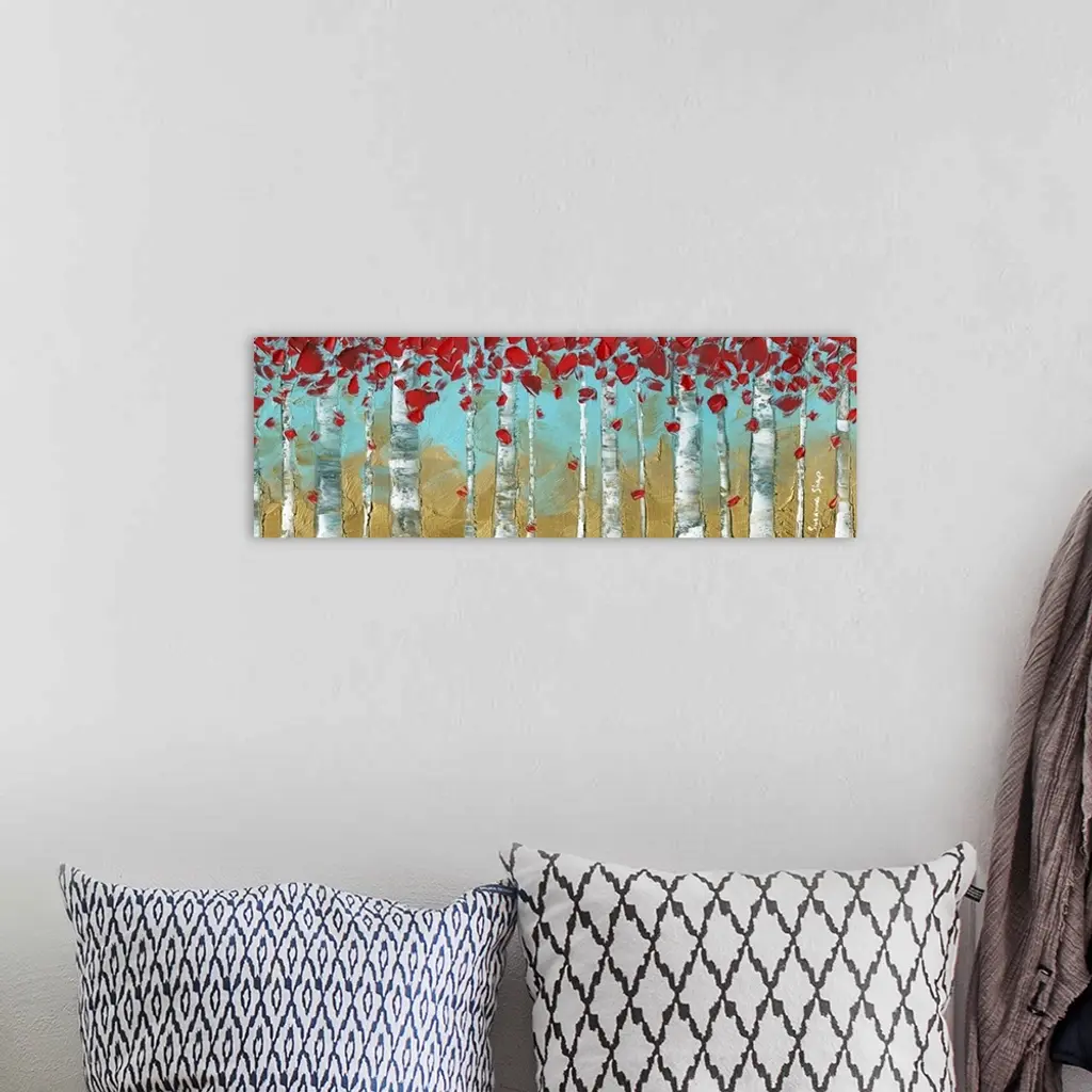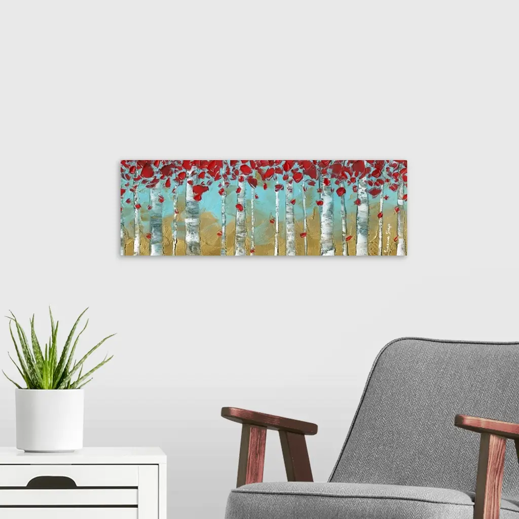 Panoramic painting of Birch trees on a gold and light blue background with bright red leaves.
