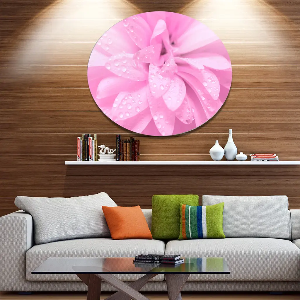 Bring Contemporary Abstraction to your home with this large Circle Metal wall art. This Abstract Pink Flower with Petals Metal Artwork makes it the focal point of any room or office. - White Gloss Coating ensures colors are extra vibrant with light reflection.- Aluminum grade Sheet Metal with 1 inch mounting frame on the back giving the illusion that the artwork is floating on the wall..- Mounting Brackets are included along with instructions.- High Quality Digital images are created directly into a glossy aluminum panel producing a stunning and captivating print into the glossy finish of the metal.- Water, Fire and Scratch resistant HD Aluminum panels.- Looks better than any photo paper and guaranteed to last at least 20 years- Easy to clean with a microfiber cloth. Colors are far superior to regular Canvas Art. - Easy to Hang
