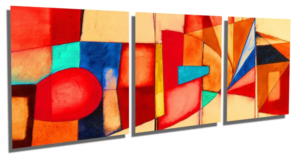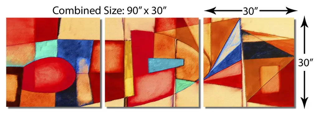 90"œ x 30"œ total size. Ready To Hang! (3 pieces - 30"œ x 30"œ each). 3 Panel Split (Triptych) panoramic Metal Print of Abstract Shapes Art. Modern metal wall art for home or office wall decor & interior design. Printed on Luxurious, HD aluminum glossy metal panels. Multi panel art.. HD aluminum panels. Metal print wall art. Includes Shadow Wall Mount on the back.• Aluminum Metal Wall Art• Made in USA• Ready to hang - No assembly required• Shadow mount hardware on the back• 0.045"œ thick HD Aluminum Panels• Scratch resistant, glossy finish• Superb color clarity, luxurious prints• Epson printing process• For indoor or moisture rich environment use• Easy to clean. Gently wipe with microfiber cloth.