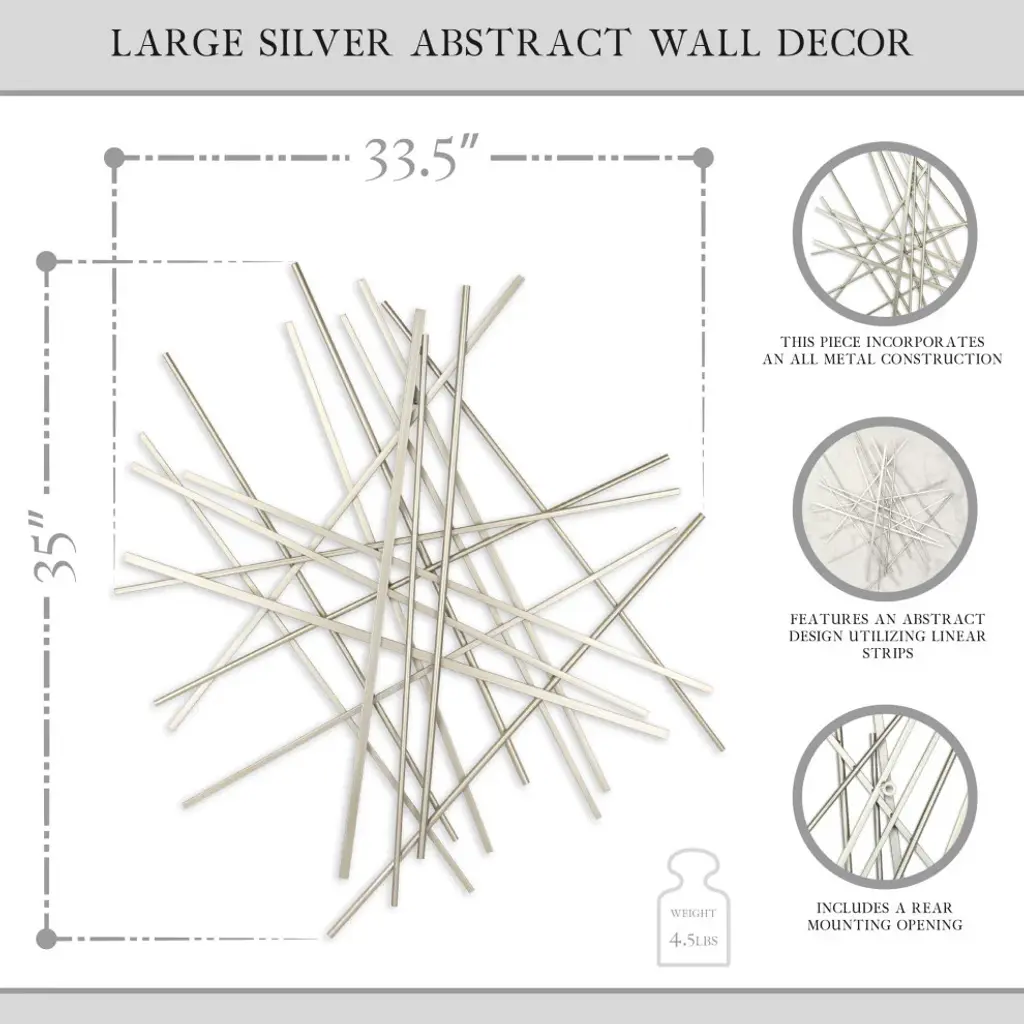 Wall decor accent pieces are a tried and true addition for all home decorators looking to enhance the look of any wall area. This piece features a abstract rod design in a silver finish and incorporates a handcrafted, all metal construction. Well suited to a wide variety of spaces, this piece will work wonderfully as an eye catching addition to your home.
