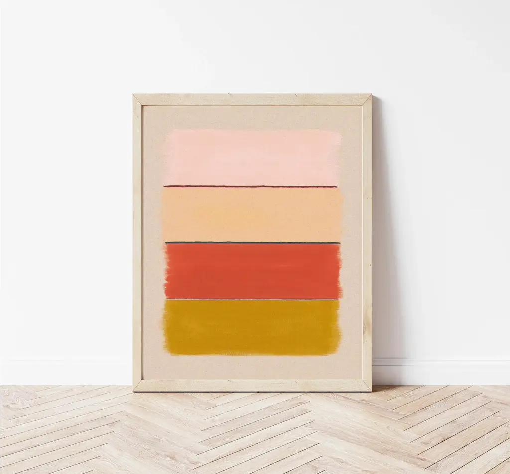 Persimmon Stack' Fine Art Print by Emily Keating Snyder Print itself is 30 x 24 in. and framed in a light wood frame with UV-shield plexiglass (approx. 31" x 25" overall) Printed on archival matte paper (no physical embroidery is present in the print) Note: Colors may appear slightly different in person due to screen variations. About the Artist: Emily Keating Snyder incorporates embroidery into her colorful minimalist abstract paintings. Her archival fine art prints visually highlight the dimensional quality of the originals. Emily's work has been featured by Anthropologie, Real Simple, Emily Henderson, Clever and Parachute Home.