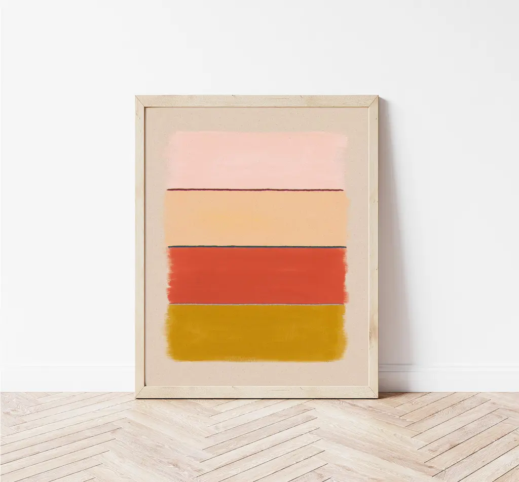 Persimmon Stack' Fine Art Print by Emily Keating Snyder Print itself is 38 x 30 in. and framed in a light wood frame with UV-shield plexiglass (approx. 39.25" x 31.25" overall) Printed on archival matte paper (no physical embroidery is present in the print) Note: Colors may appear slightly different in person due to screen variations. About the Artist: Emily Keating Snyder incorporates embroidery into her colorful minimalist abstract paintings. Her archival fine art prints visually highlight the dimensional quality of the originals. Emily's work has been featured by Anthropologie, Real Simple, Emily Henderson, Clever and Parachute Home.