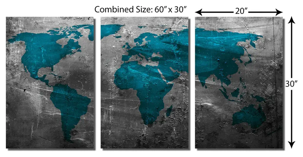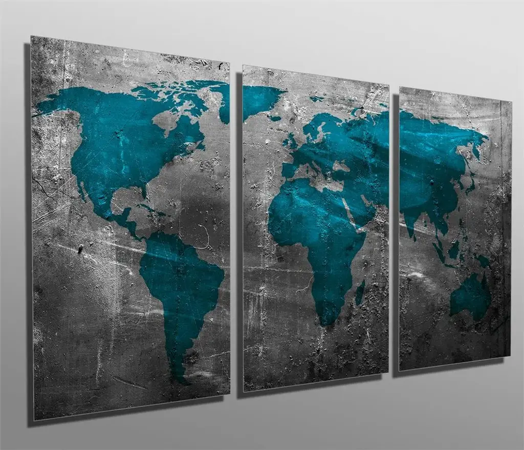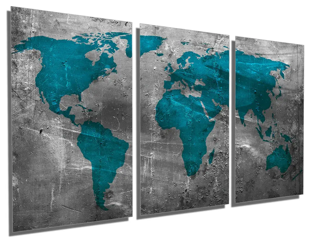 60"œ x 30"œ total size. Ready To Hang! (3 pieces - 20"œ x 30"œ each). 3 Panel Split (Triptych) Abstract art World Map Metal Print ft. shades of teal and gray colors. Modern metal wall art for home or office wall decor & interior design. Printed on Luxurious, HD aluminum glossy metal panels. Multi panel art.. HD aluminum panels. Metal print wall art. Includes Shadow Wall Mount on the back.• Aluminum Metal Wall Art• Made in USA• Ready to hang - No assembly required• Shadow mount hardware on the back• 0.045"œ thick HD Aluminum Panels• Scratch resistant, glossy finish• Superb color clarity, luxurious prints• Epson printing process• For indoor or moisture rich environment use• Easy to clean. Gently wipe with microfiber cloth.