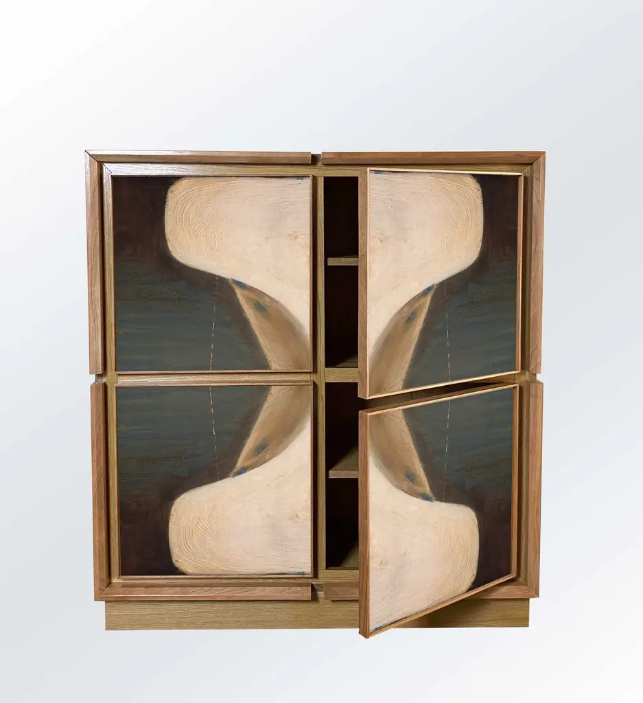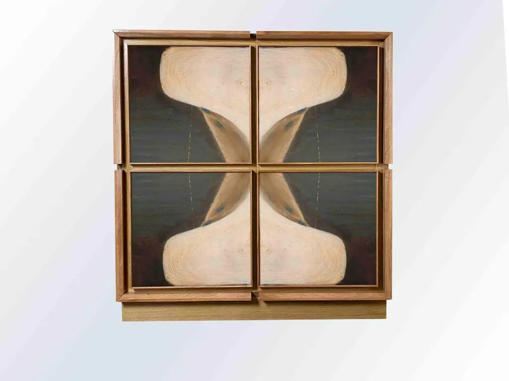 Oak sideboard with cherry frames and walnut details. Divided into four spaces with internal shelves, it has four doors with abstract decorations and paintings. Limited edition of 10 pieces, numbered and signed. Signed by Maker,Labeled by Maker