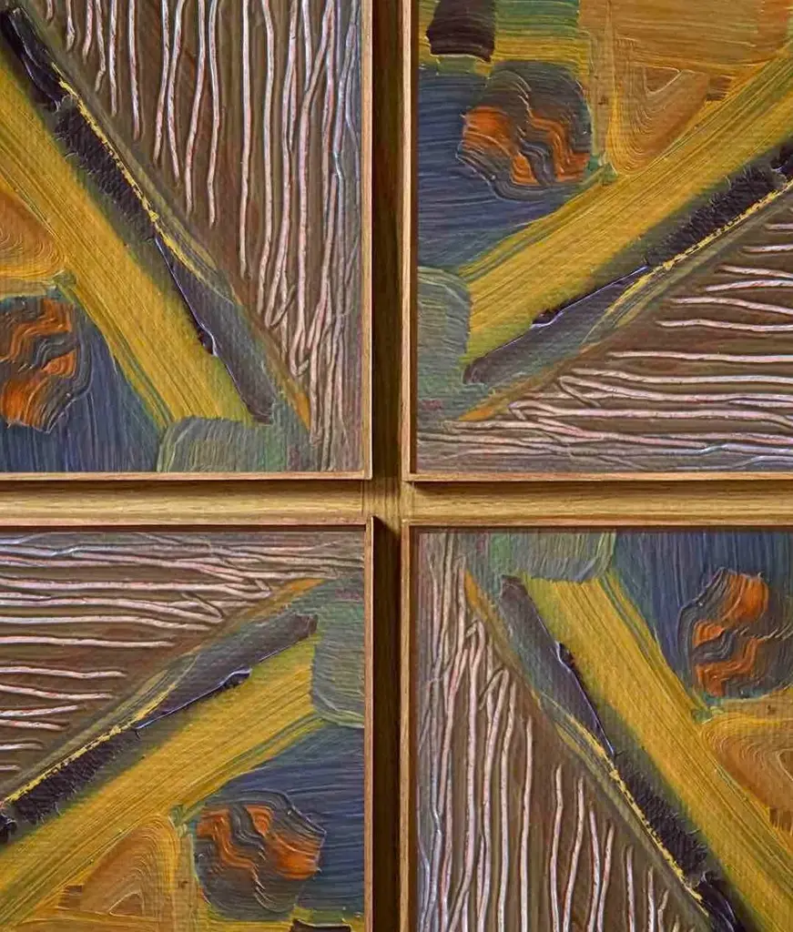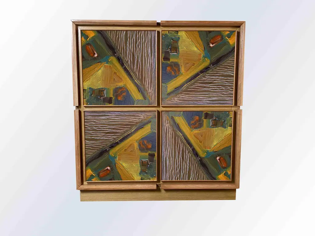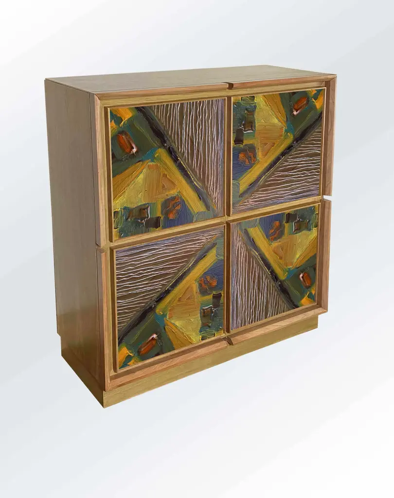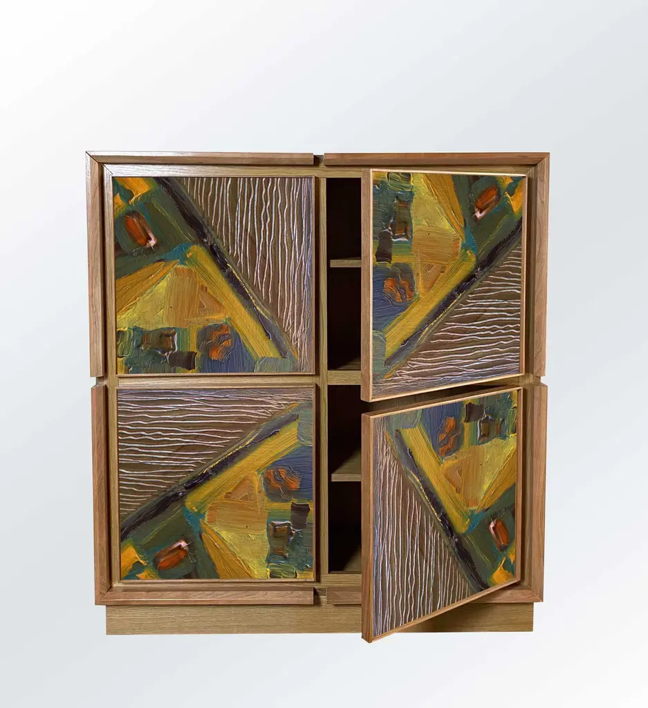 Oak sideboard with cherry frames and walnut details. Divided into four spaces with internal shelves, it has four doors with abstract decorations and paintings. Limited edition of 10 pieces, numbered and signed. Signed by Maker,Labeled by Maker
