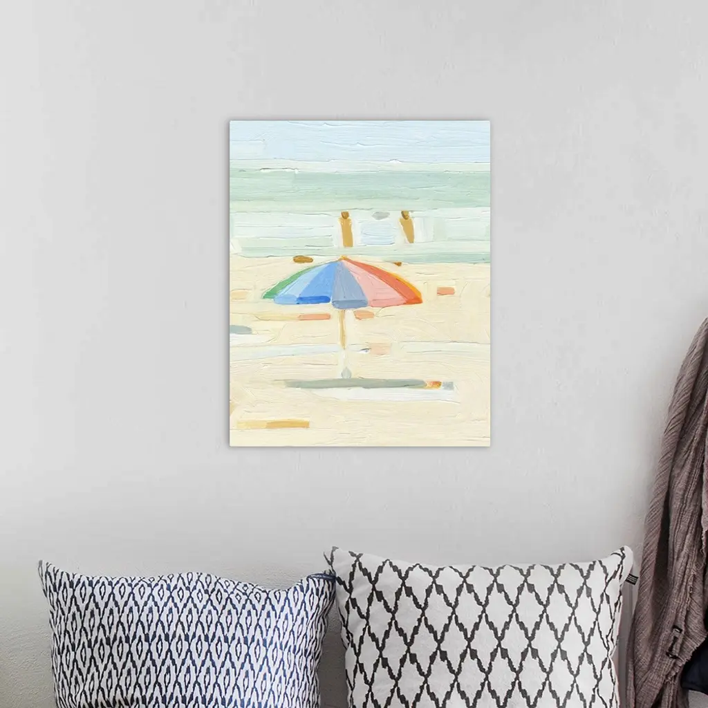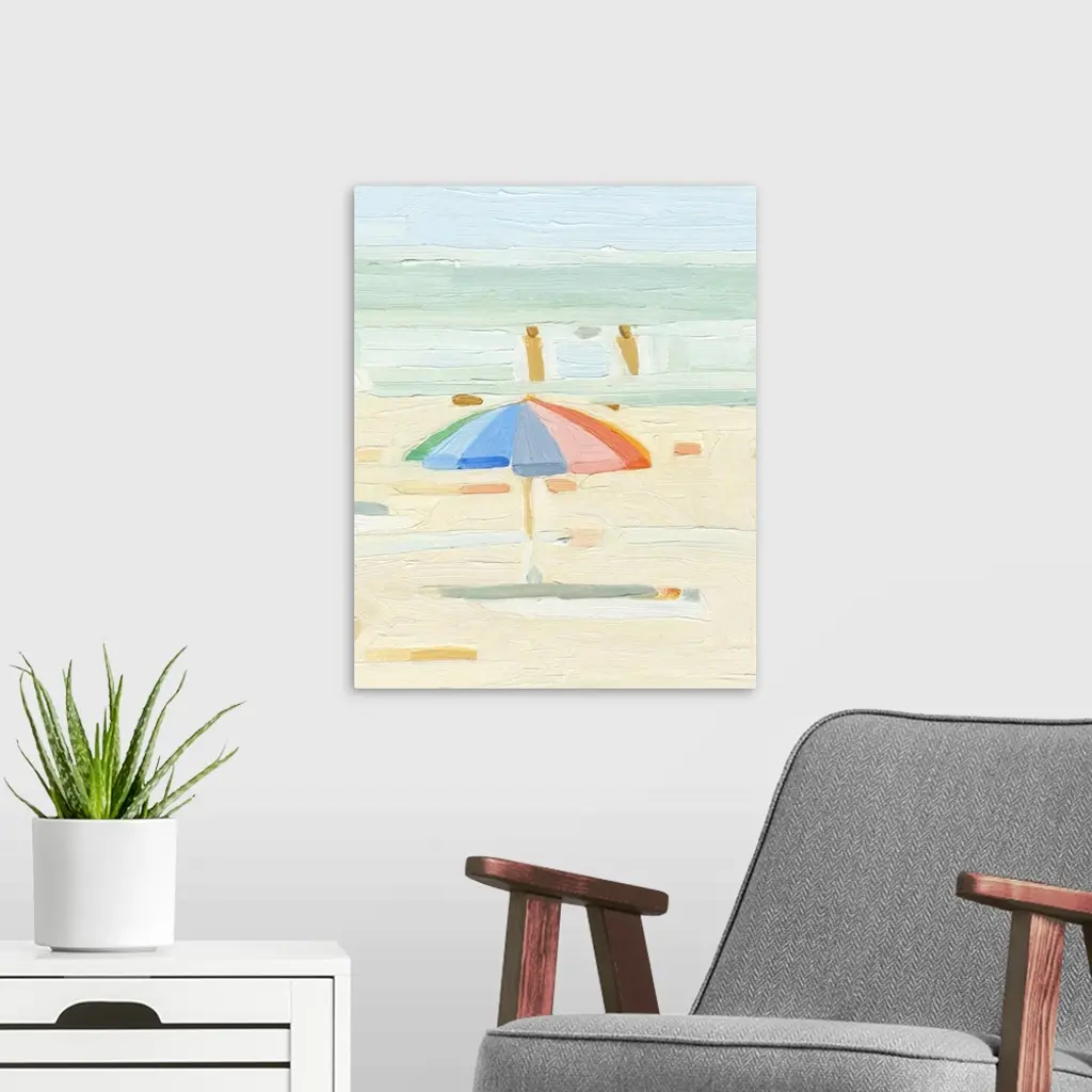 A contemporary acrylic painting of a single colorful beach umbrella, painted in a very abstracted style with thick brush strokes. Perfect for a beach house or bathroom or any coastal theme.