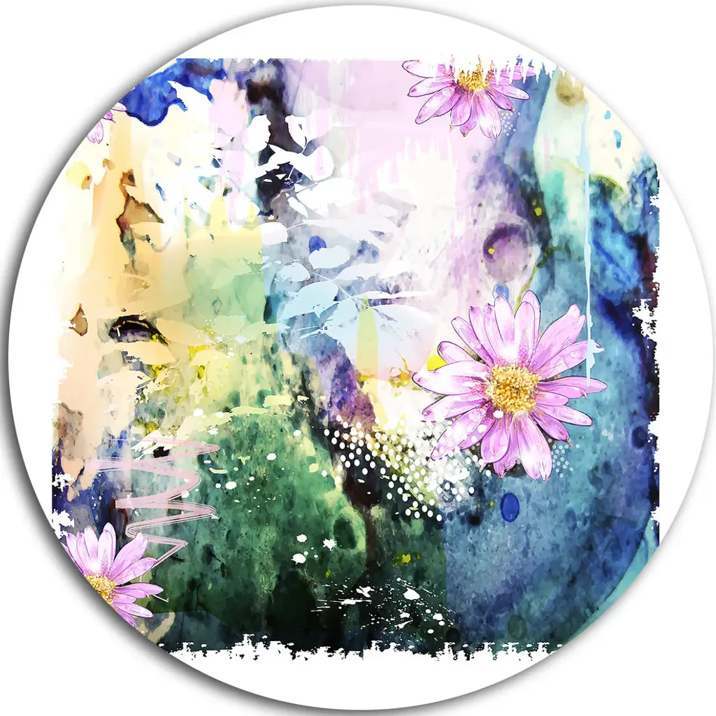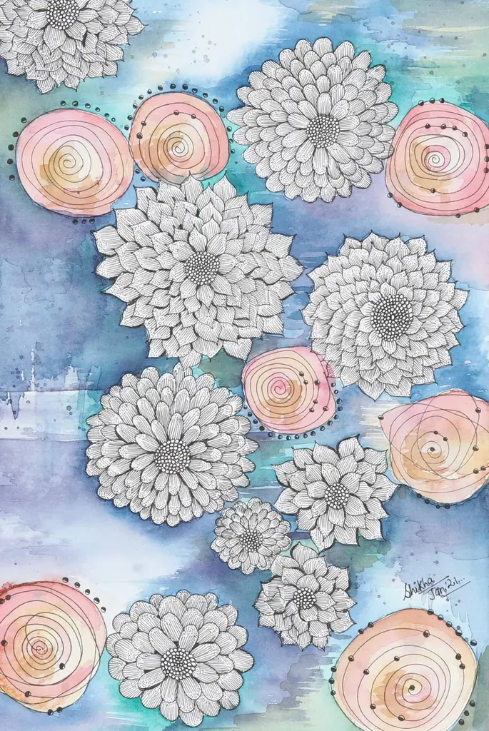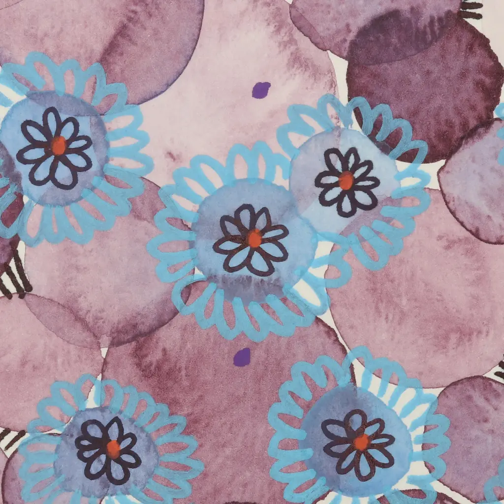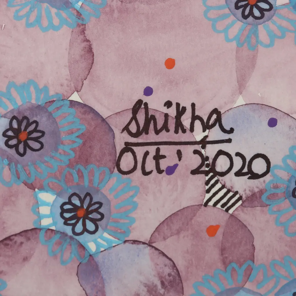 Combining patterns found in the sky--including stars and foliage--Shikha Kaistha, paints this breathtaking watercolor on cold-pressed paper. The Indian artisan layers blue flowers over lavender circles, taking advantage of the medium's translucent properties to create depth of color.