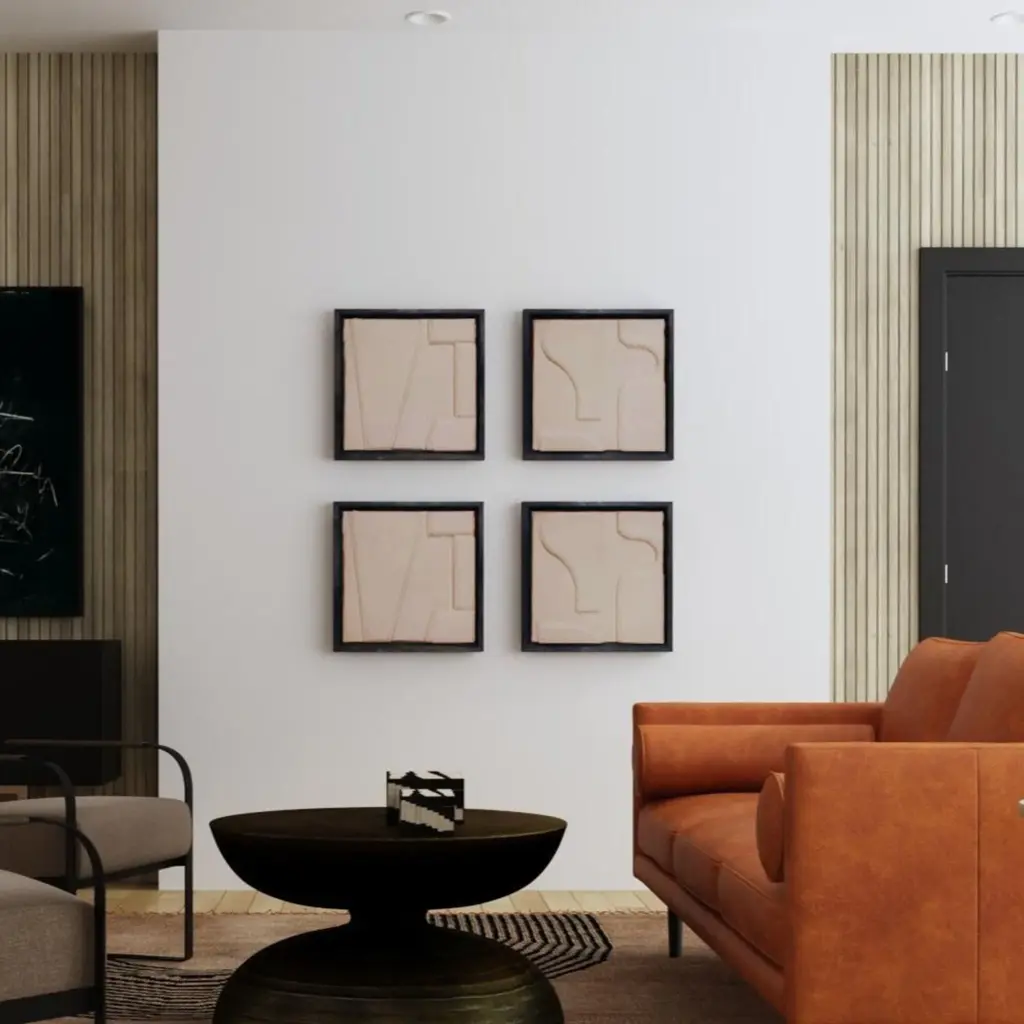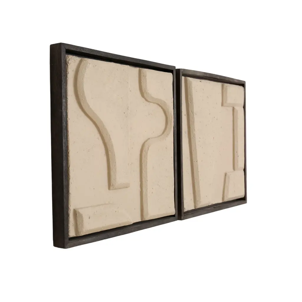 A stunning pair of modern, minimal wall art pieces with an organic, global style. Crafted from natural mango wood, each square shadowbox in the set of two shows a linear abstract design in soft, natural beige and browns to add subtle texture and dimension to a gallery wall or open shelf decor display. Create a gallery wall by adding multiples for depth and dimension.