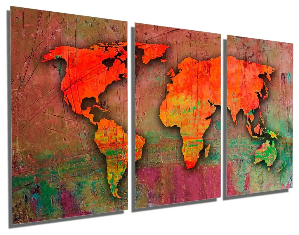 72"œ x 36"œ total size. Ready To Hang! (3 pieces - 24"œ x 36"œ each). 3 Panel Split (Triptych) Abstract World Map Metal Print. Features abstract digital effect. Modern metal wall art for home or office wall decor & interior design. Printed on Luxurious, HD aluminum glossy metal panels. Multi panel art.. HD aluminum panels. Metal print wall art. Includes Shadow Wall Mount on the back.• Aluminum Metal Wall Art• Made in USA• Ready to hang - No assembly required• Shadow mount hardware on the back• 0.045"œ thick HD Aluminum Panels• Scratch resistant, glossy finish• Superb color clarity, luxurious prints• Epson printing process• For indoor or moisture rich environment use• Easy to clean. Gently wipe with microfiber cloth.