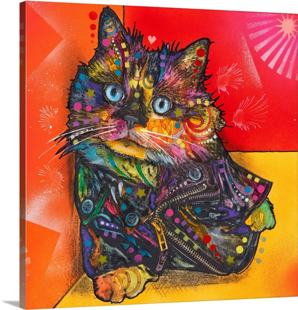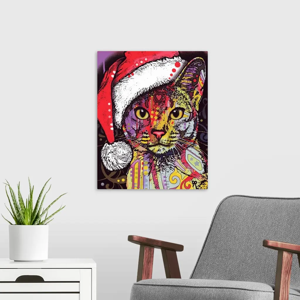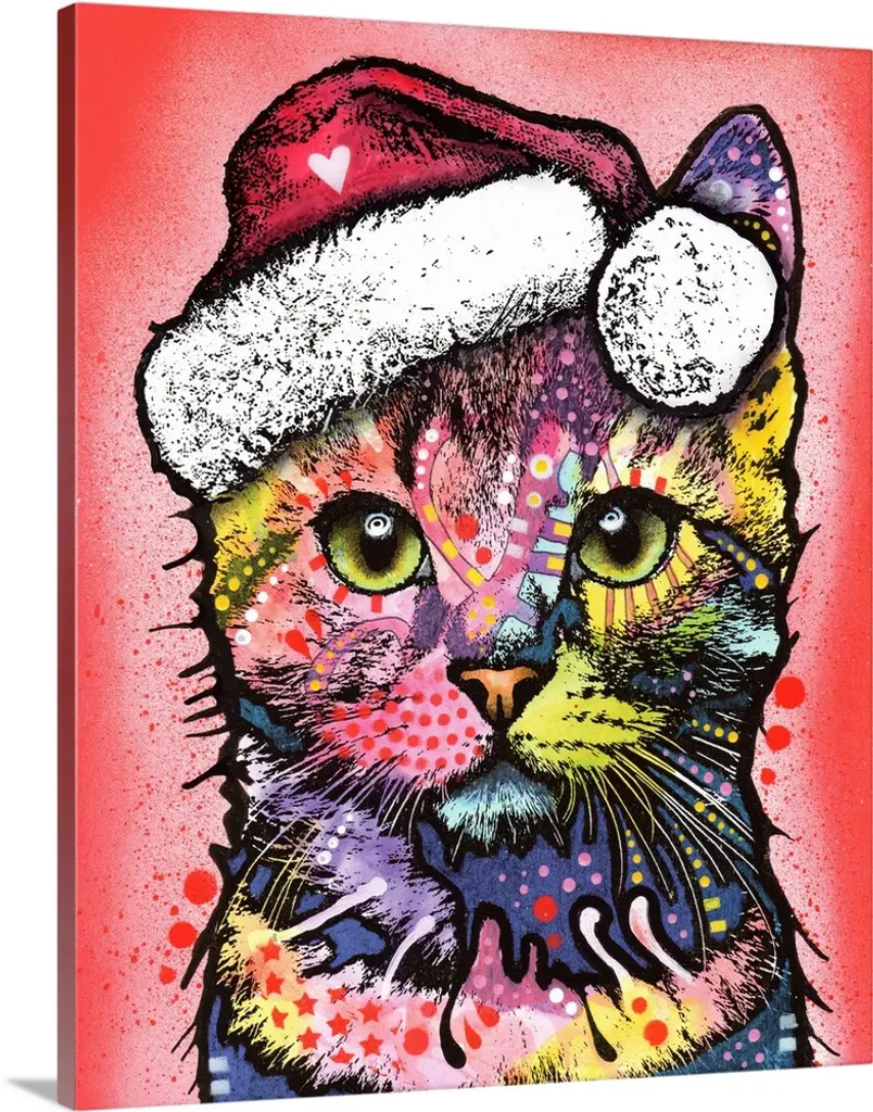Cute painting of a colorful cat with abstract designs wearing a Christmas hat.