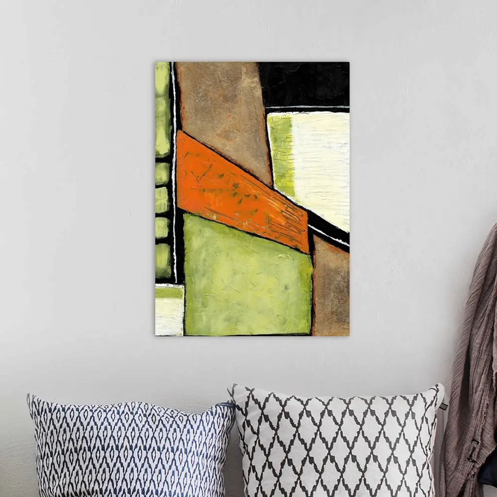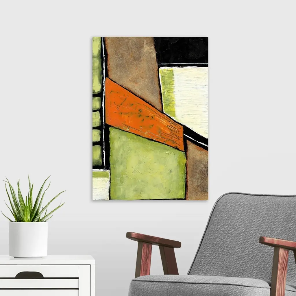 Contemporary abstract painting using geometric shapes in pale muted tones.