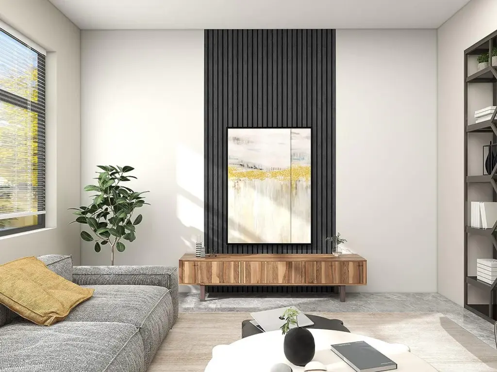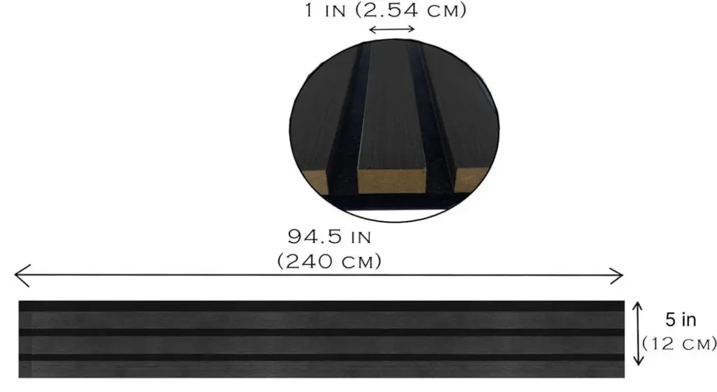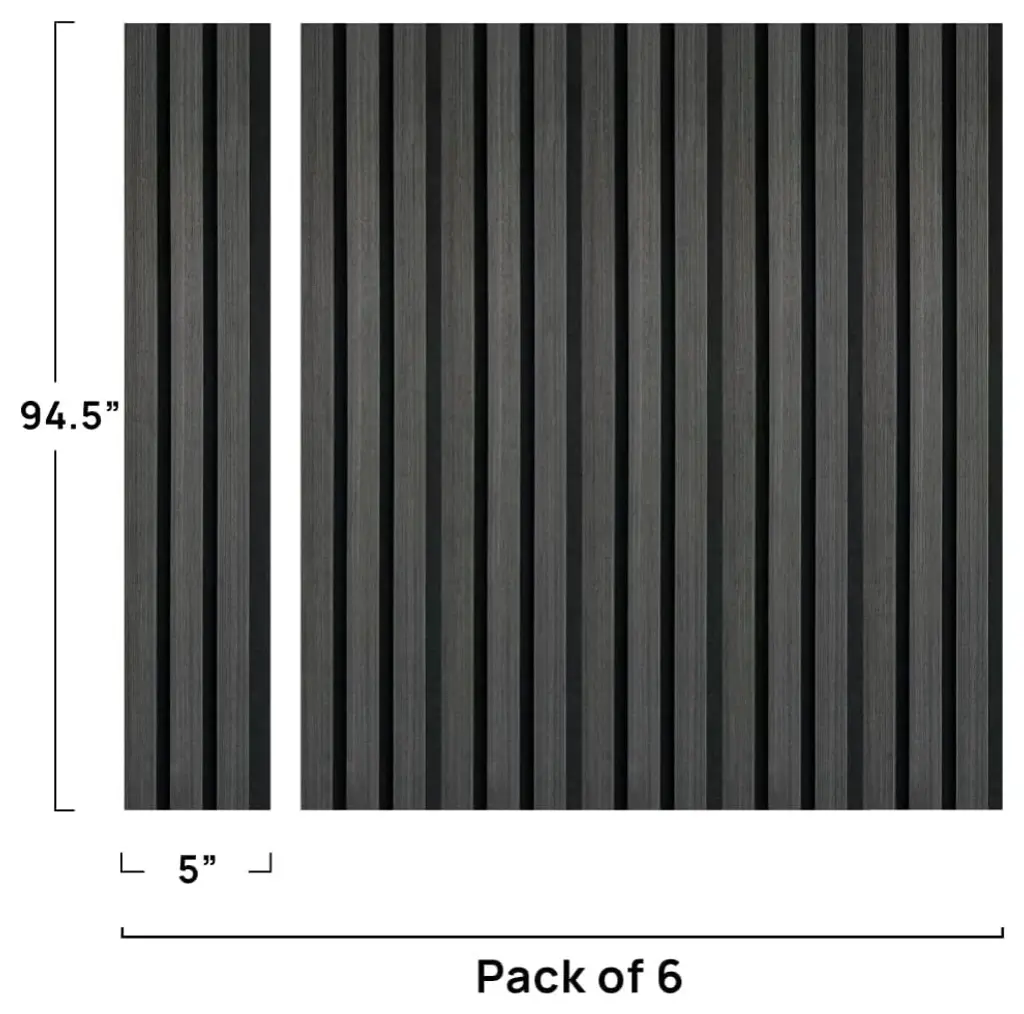Revitalize any area with our Acoustic Wood Slat Wall Panels, perfect for soundproofing and aesthetic enhancement. Ideal for stylish accent walls, our textured wall panel design is suited for home and office decor. These versatile wood wall panels seamlessly integrate with any interior, offering both decorative and noise-cancelling features.Experience the sophistication of Charcoal acoustic wood wall panels, ideal for creating a bold, contemporary look. This deep, muted tone, akin to black wall panels, adds luxury and a modern edge to any interior, from gaming wall panels to elegant office spaces.KEY BENEFITS OF WALL ACOUSTIC PANELS:- SUPERIOR SOUNDPROOFING: Experience unmatched noise reduction with our Acoustic Wood Wall Panels. Soundproofing panels perfect for noise cancelling in any space.- EASY INSTALLATION: Effortlessly install our lightweight, 5 lb Wood Slat Wall Paneling with diverse options like adhesive and nails - ideal for swift interior decor updates.- ECO-FRIENDLY MATERIALS: Crafted from sustainable CARB P2 grade MDF, these eco-friendly Wood Panels for Wall are a conscious choice for environmentally savvy decor.- ENHANCED ROOM ACOUSTICS: Minimize echo and boost sound clarity in home theaters and studios with our Acoustic Panels Sound Absorbing - a must for quality acoustics.- STYLISH AND MODERN DESIGN: Discover elegance with our 3D Textured Wall Art Wood Wall Panels; a sophisticated, modern design in various colors for stylish wall decor.TECHNICAL SPECIFICATIONS:DIMENSIONS: W 5" / D 0.8" / H 94.5" "” easy transport and installation.WEIGHT: 5 lb. per panel for simple mounting, 30 lb. per box.MATERIALS: Quality wood veneer, MDF board, PET polyester fibre.Sound observation: up to 80%, effectively reduces ambient noise.ACOUSTIC QUALITY: Minimizes echo, ideal for gaming, and improves sound clarity.SAFETY STANDARDS: Meets EN 13501-1:2018 CLASS B, ASTM E84 CLASS A.INSTALLATION AND MAINTENANCE: CUTTING FLEXIBILITY - Easy cutting for precise fitting using standard tools.MOUNTING OPTIONS - Adhesive, nails, or bolts for various wall types.EASY ALIGNMENT - Interlocking design for a seamless finish.LOW MAINTENANCE - Vacuum or wipe with a dry cloth; avoid water.USE CASE IDEAS FROM OUR CUSTOMERSHOME AND PERSONAL SPACESHOME ENTERTAINMENT AREAS:Ideal for soundproofing wall and acoustic panels sound absorbing, these panels enhance TV and audio system sound quality.BEDROOMS:Perfect as headboard panels for wall, offering noise reduction panels and a peaceful sleep environment.HOME OFFICES:Create a focused workspace, ideal for noisy neighbors soundproofing and reducing external distractions.CHILDREN"™S PLAYROOMS:Use as sound blocking panels to minimize noise transfer, ensuring playtime is enjoyable without disturbing others.HOME GYMS AND RECREATION AREAS:Ideal for gaming wall panels and acoustic wood wall panels, controlling noise for a focused activity space.PROFESSIONAL AND COMMERCIAL ENVIRONMENTSOFFICE SPACES AND CONFERENCE ROOMS:Reduce ambient noise, perfect for open-plan offices and meeting areas with wood acoustic panels and noise cancelling wall panels.CAFÉS AND RESTAURANTS:Serve as decorative wood panels and paneles acusticos para pared, creating a pleasant dining atmosphere.HOTELS AND HOSPITALITY VENUES:Enhance guest comfort in lobbies and rooms with noise cancelling panels and stylish wood slat wall paneling.EDUCATIONAL, HEALTH, AND WELLNESS FACILITIESCLASSROOMS AND EDUCATIONAL SETTINGS:Improve speech clarity and reduce distractions, great for acoustic wall panels decorative in learning environments.YOGA STUDIOS AND WELLNESS CENTERS:Create a tranquil environment with wall soundproofing panels, ideal for rented spaces.CREATIVE AND RECREATIONAL USERECORDING STUDIOS AND MUSIC PRACTICE ROOMS:Control sound reflections with slatted wall panels and enhance recording quality where sound clarity is crucial.CONTENT CREATION AREAS:Perfect for content creators and streamers, offering acoustic panel art and microphone audio quality improvement.ART STUDIOS AND GALLERIES:Improve acoustics and add a modern touch with 3D wood wall panels and acoustic diffuser panels.UNIQUE AND CUSTOM APPLICATIONSLIBRARIES AND QUIET STUDY AREAS:Ideal as acoustic wall panels sound absorbing, reducing noise levels for a focused environment.BASEMENTS AND HOME THEATERS:Optimize sound quality with acoustic slat wood wall panels for an immersive movie experience.