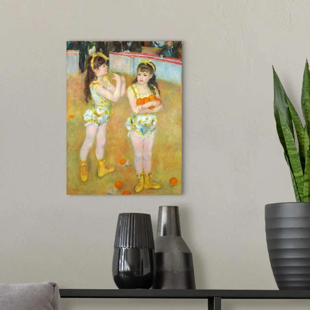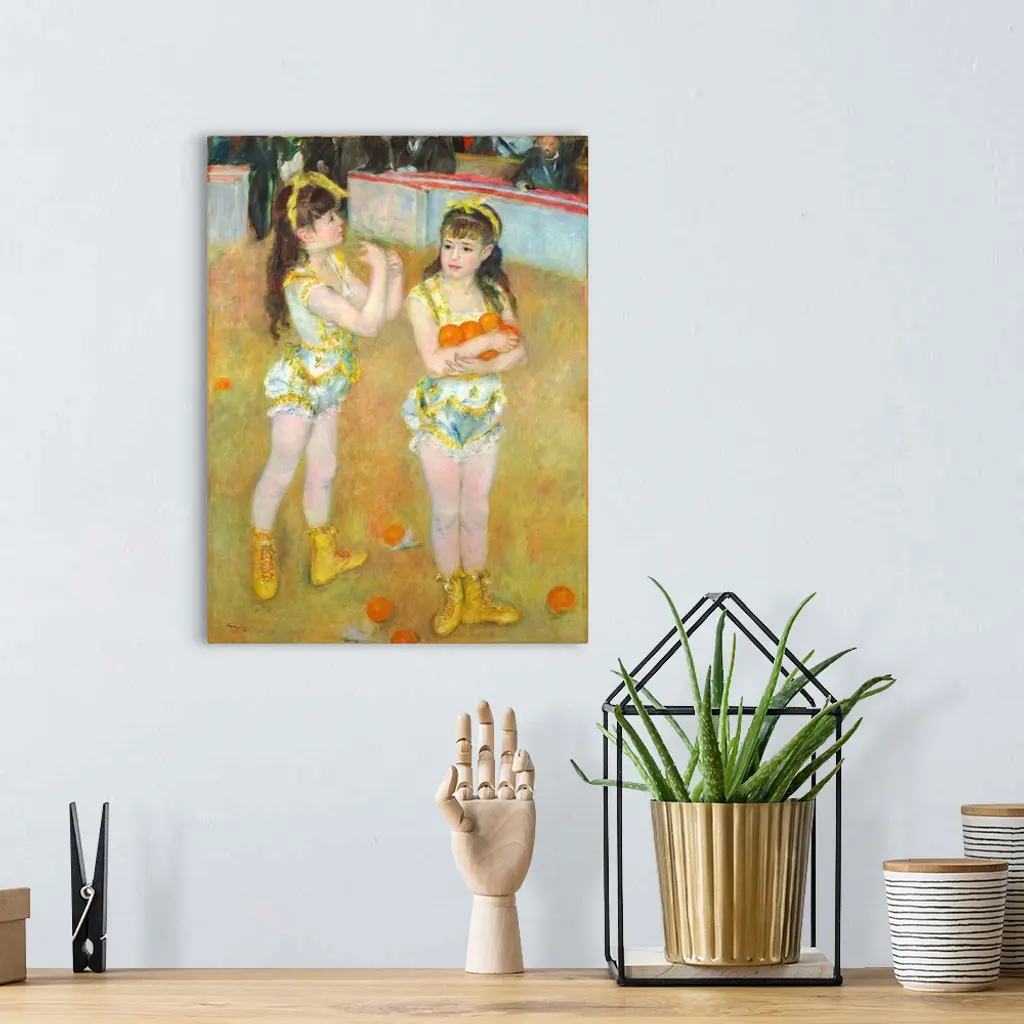 The two little circus girls in this painting are Francisca and Angelina Wartenberg, who performed as acrobats in the famed Cirque Fernando in Paris. Although they were depicted in the center of a circus ring, the sisters actually posed in costume in Pierre-Auguste Renoir's studio, enabling him to paint them in daylight. Here he portrayed them just as they have finished their act and are taking their bows. One sister turns to the crowd, acknowledging its approval, while the other faces the viewer with an armful of oranges, a rare treat that the audience has tossed in tribute. Although Acrobats at the Cirque Fernando, reflects the artist's enchantment with the innocence of childhood - he has enveloped the girls in a virtual halo of pinks, oranges, yellows, and whites - the partially visible, darkly clothed (mainly male) spectators allude to the less wholesome, nocturnal demimonde of the nineteenth-century circus in which these two young performers grew up. The famed Chicago collector Mrs. Potter Palmer purchased Acrobats at the Cirque Fernando in 1892 and was so enamored of the picture that she kept it with her at all times, even on her travels abroad.