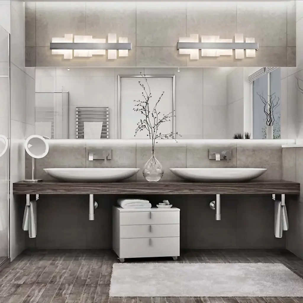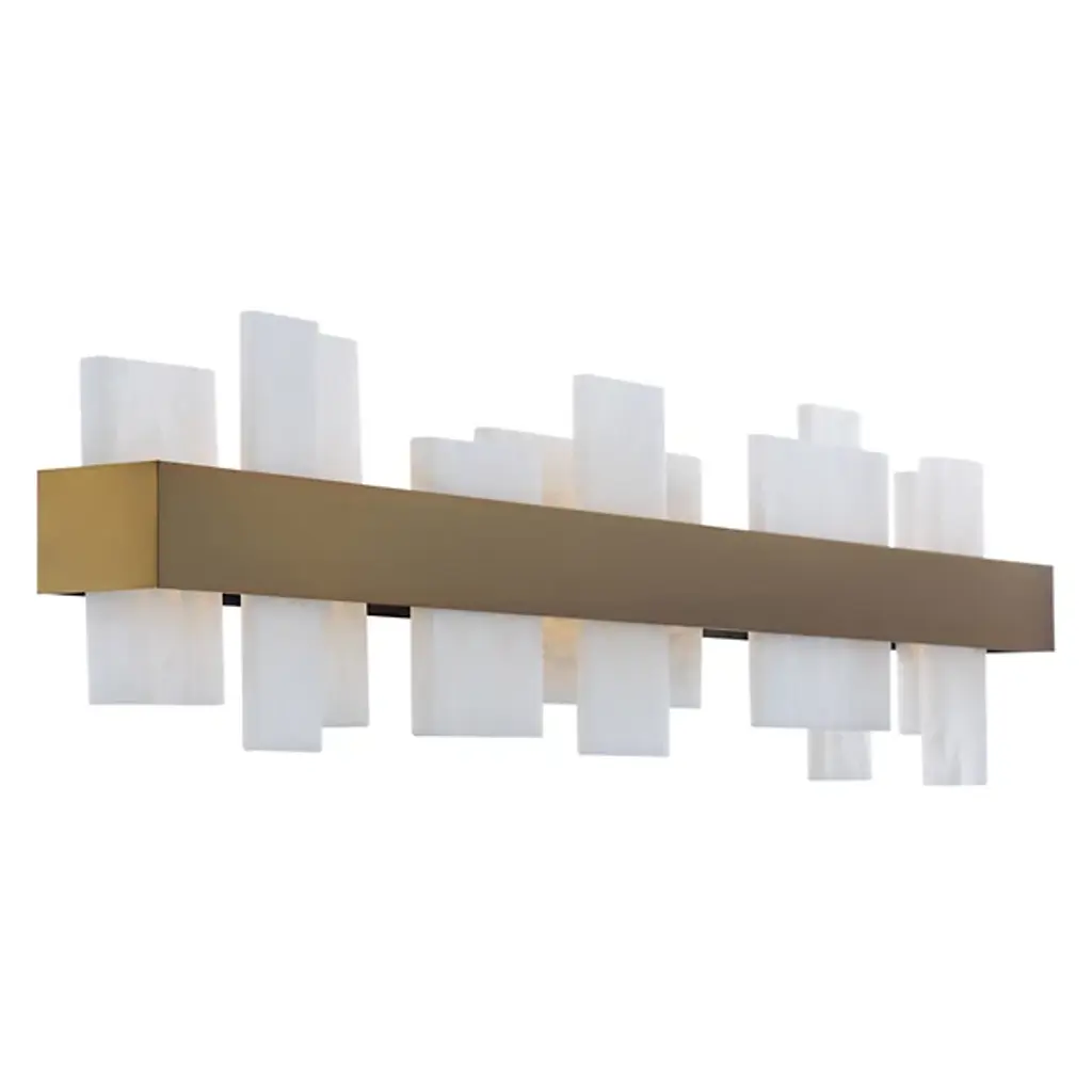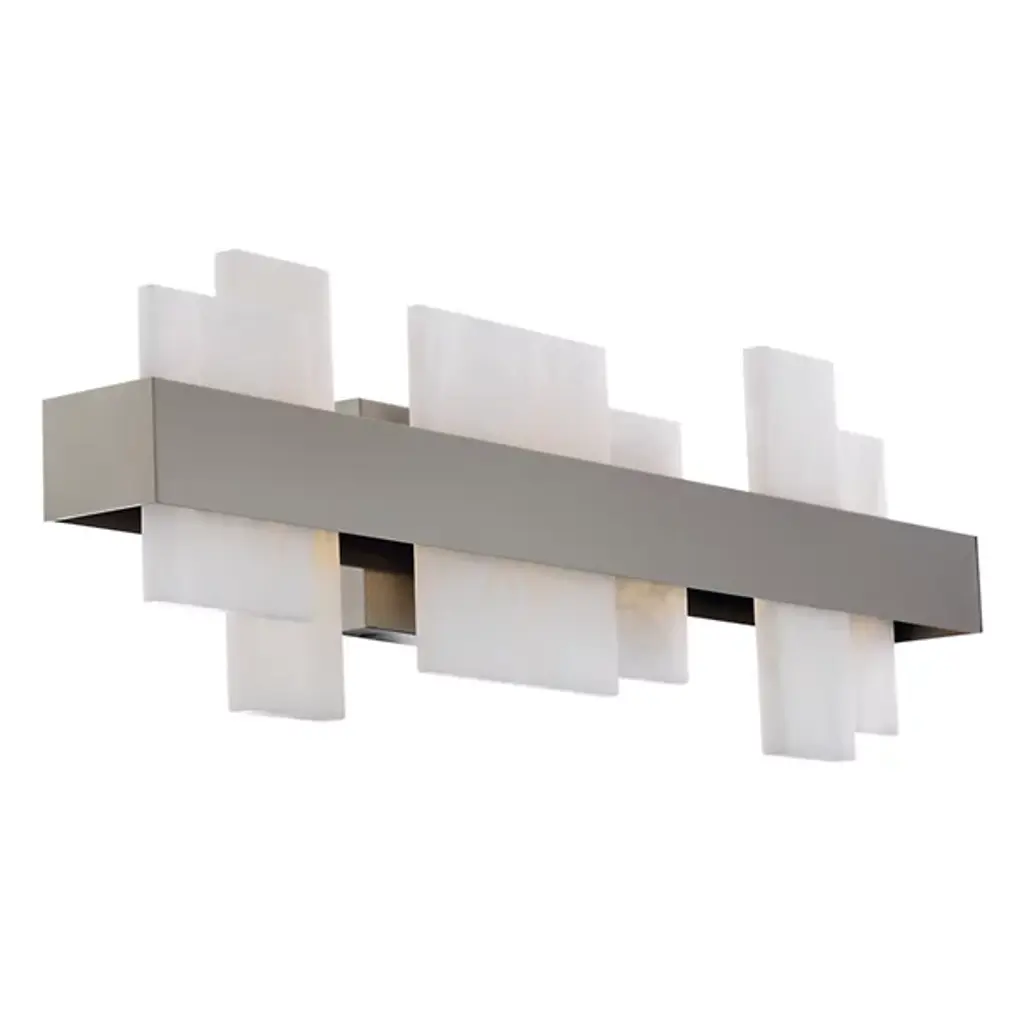 The Acropolis LED Vanity Light by Modern Forms is a statement luminaire, blurring sculpture and design. The abstract lightscape features undulating natural Spanish alabaster forms reflected below a luminous metal band. This mid-century modern bath luminaire draws you in with a beautiful metal structure defined by pure geometry. Adjust your fixture's brightness level by pairing the Acropolis LED Vanity Light with an ELV or TRIAC dimmer.