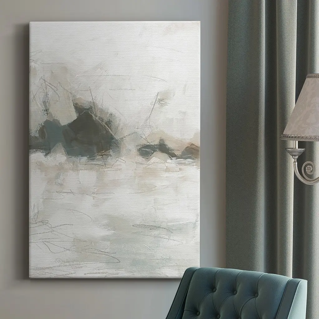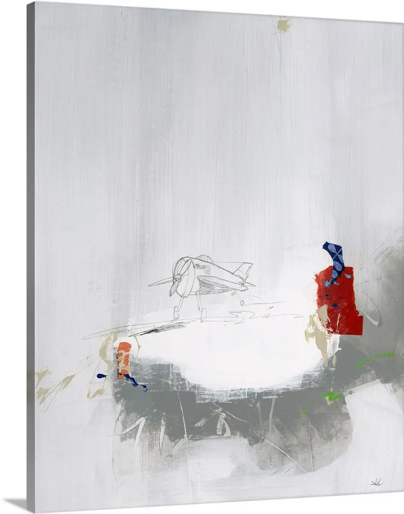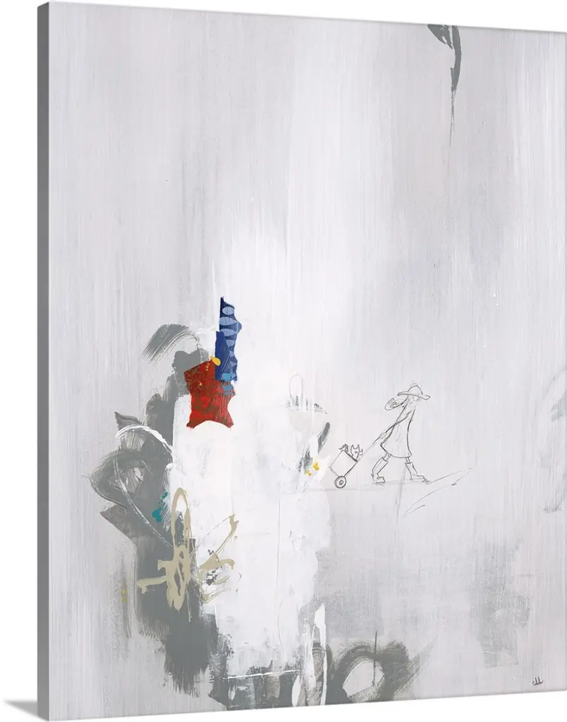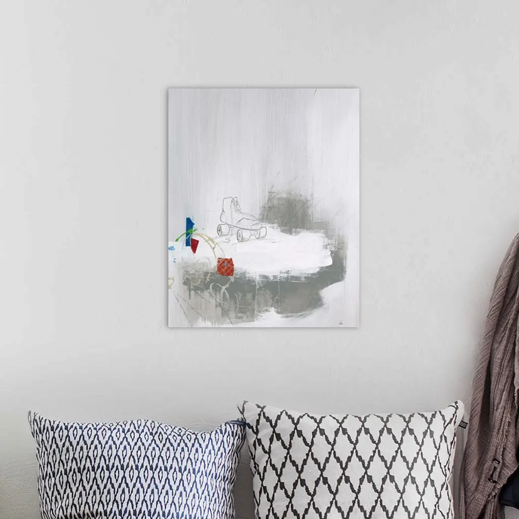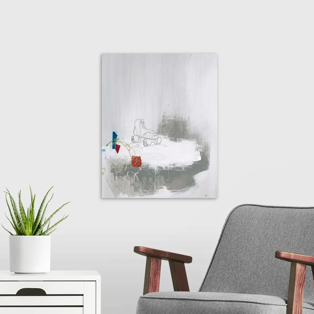Contemporary abstract painting of a pencil drawing of a roller skate against a neutral toned background, with splashes of color.