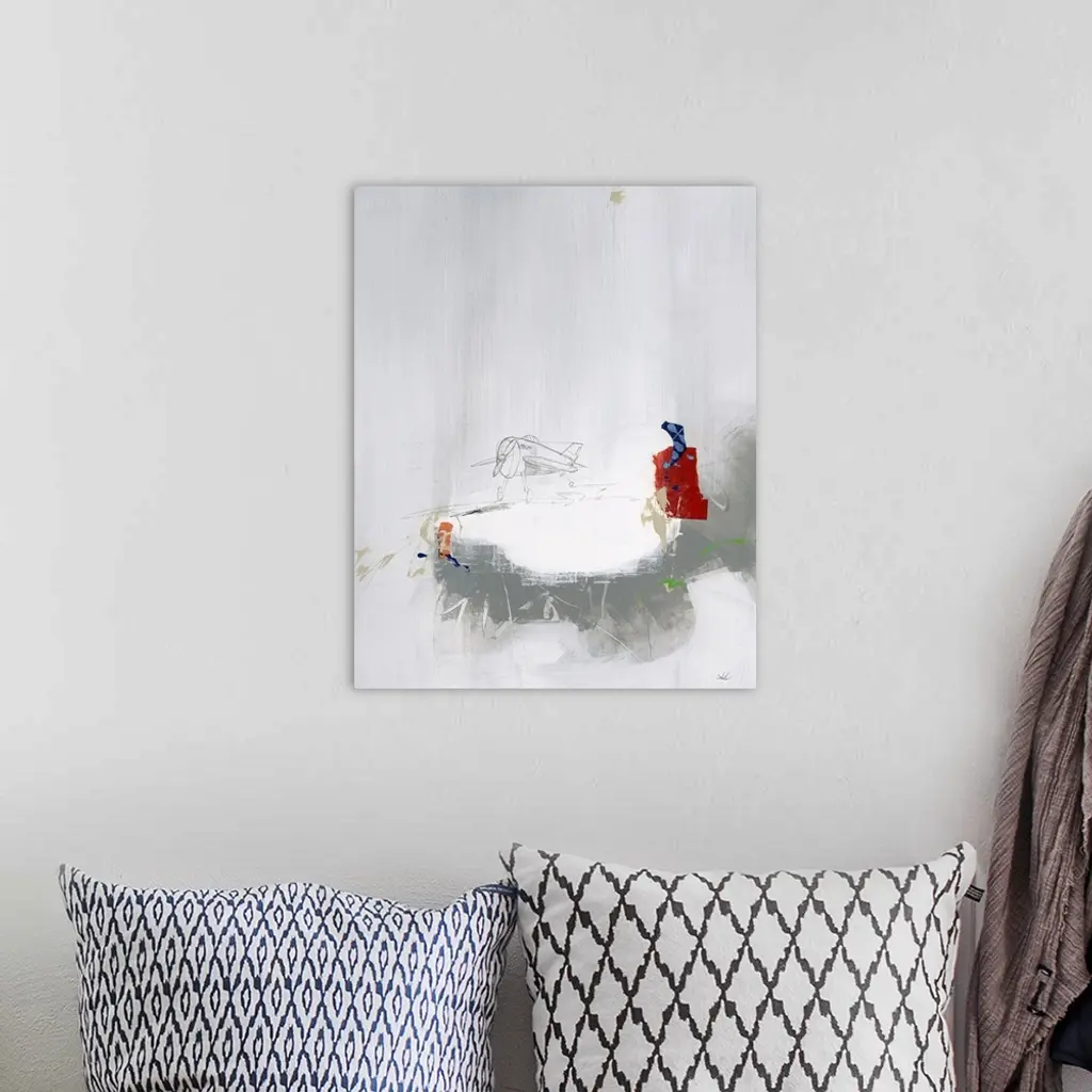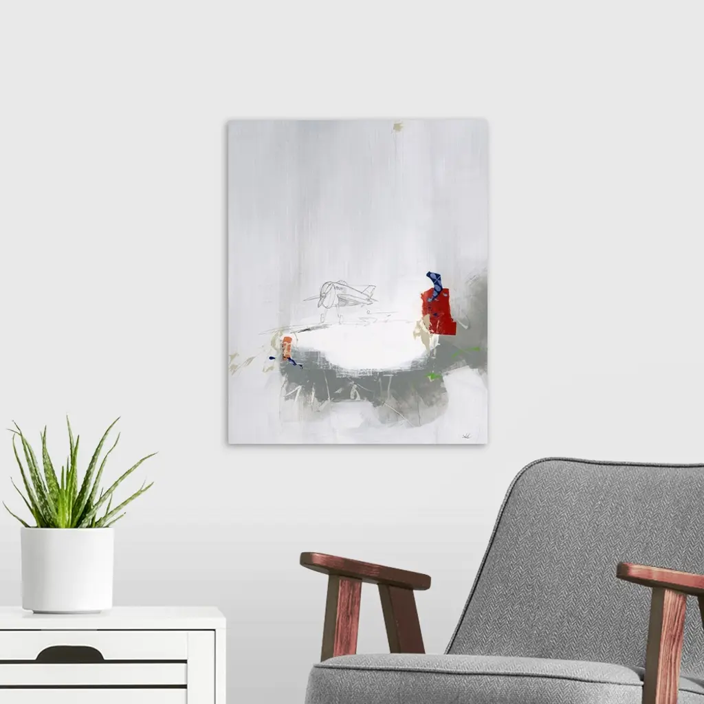 Contemporary abstract painting of a pencil drawing of an airplane against a neutral toned background, with splashes of color.