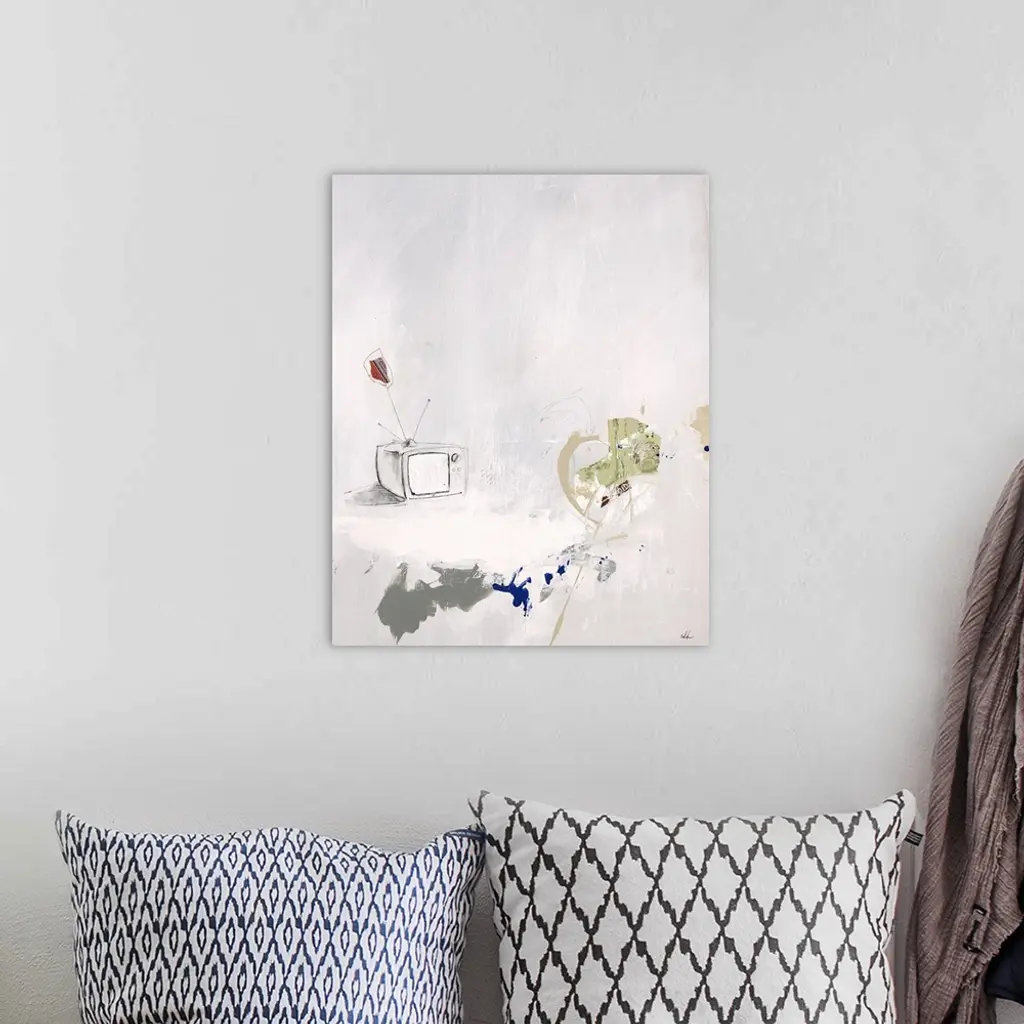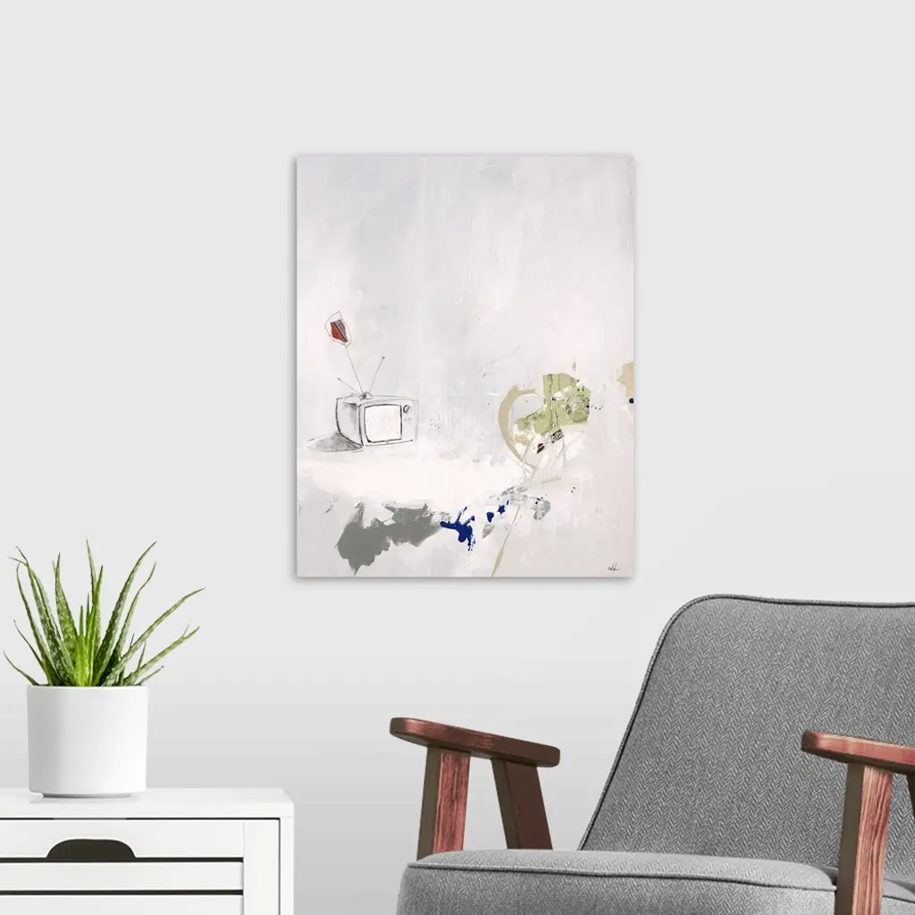 Contemporary abstract painting of a pencil drawing of a TV set against a neutral toned background, with splashes of color.