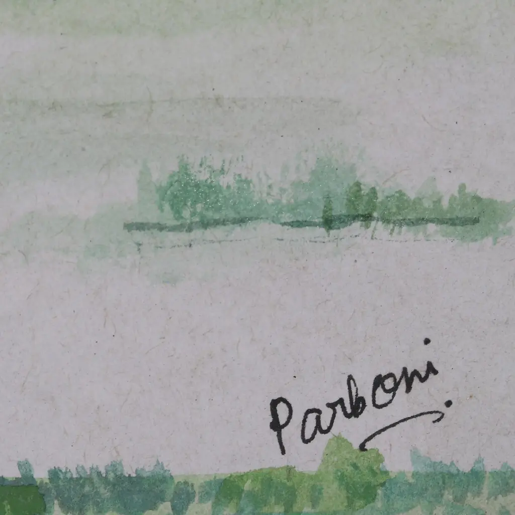 Created with a combination of acrylic, ink, and watercolor, Parboni Ghosh's colorful painting depicts Lord Krishna wife, Radha, worshipping his feet under a large tree. The Indian artist uses blues, greens, and oranges to paint the couple in shimmering jewels and traditional attire.