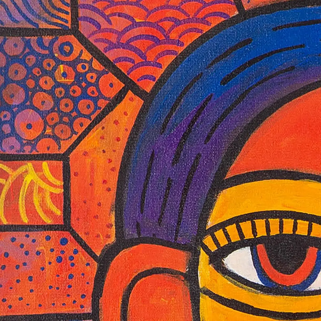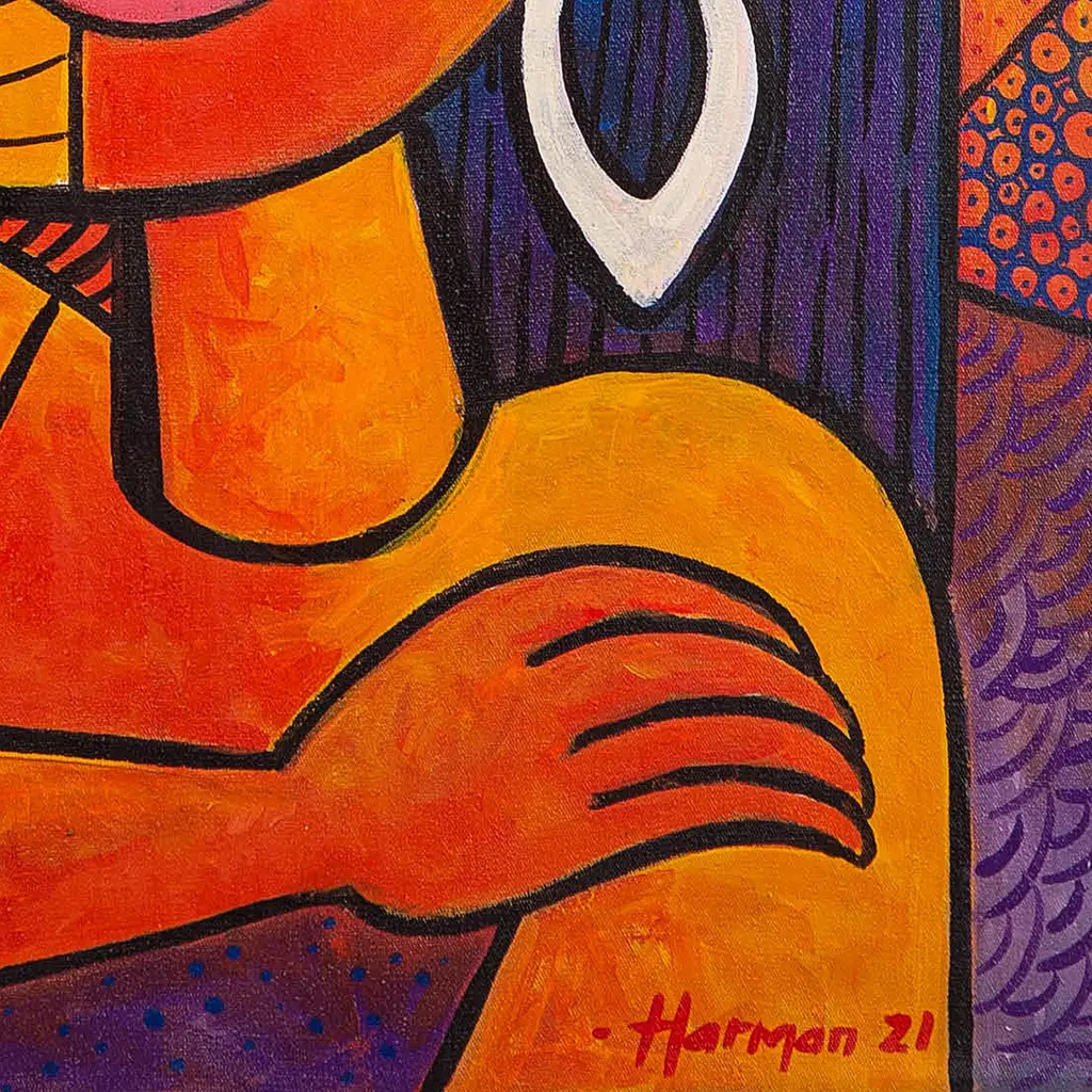 "The perfect couple consists of two imperfect people," says Javanese artist Harman, who observes the intimate relationship between man and woman in this illustrative acrylic painting. Using a predominantly warm color palette, the artist delineates each figure with dark paint, creating a shallow depth of field influenced by Cubism.