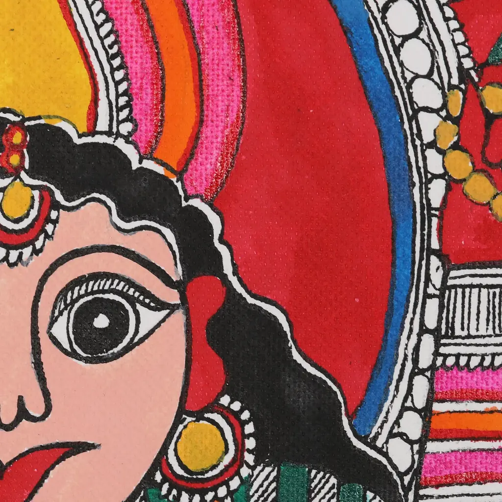 Welcome wisdom and music into your home with Vidushini's gorgeous painting, which depicts Hindu goddess Saraswati holding an Indian instrument called a veena. The artisan uses bright acrylic to create the Madhubani painting, a graphic style of folk art originating in the Mithila region of India.