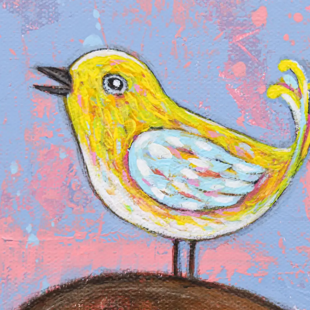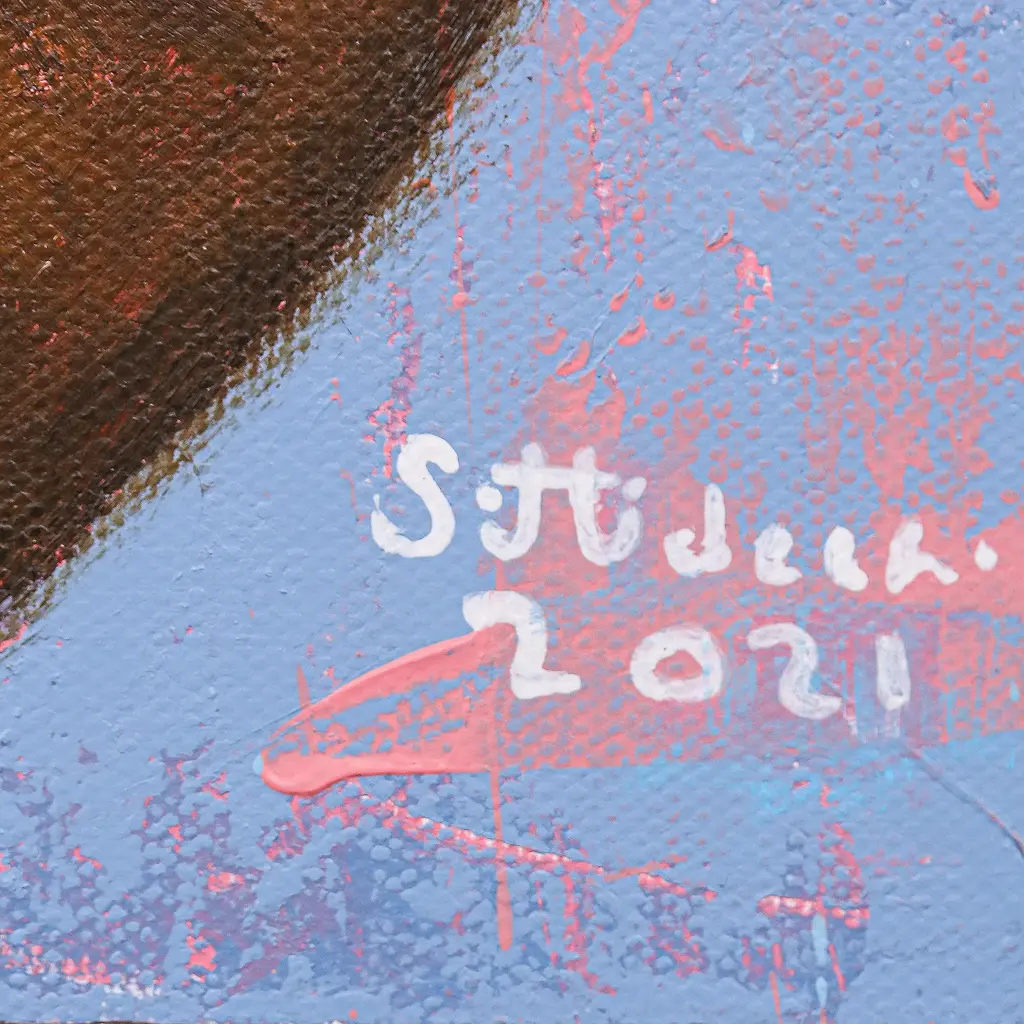 The most charming scene of a cat sharing a smile with its bird friend standing on its tail is crafted in Naif style by Thai artist Noi. The canvas is worked with beautiful strokes of acrylic paint for both the lovely animals and the light blue and pink background in a work of art that delights and amazes.