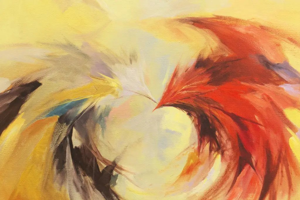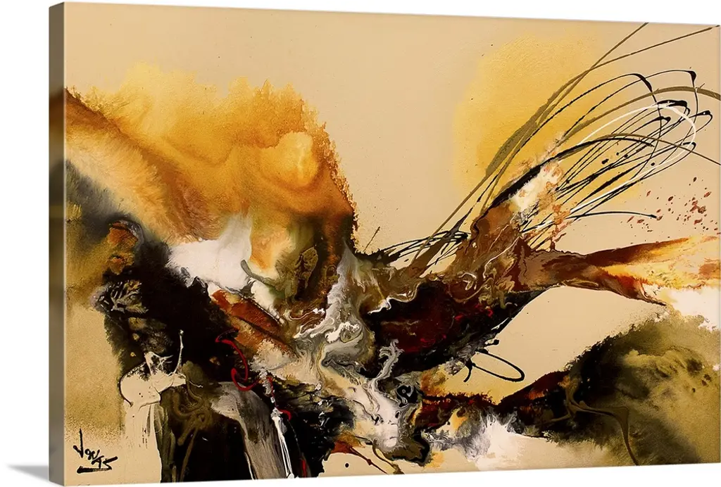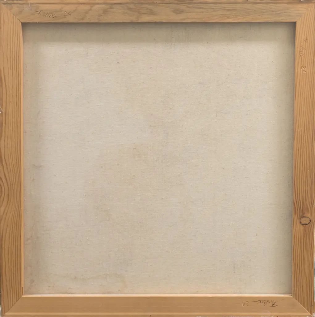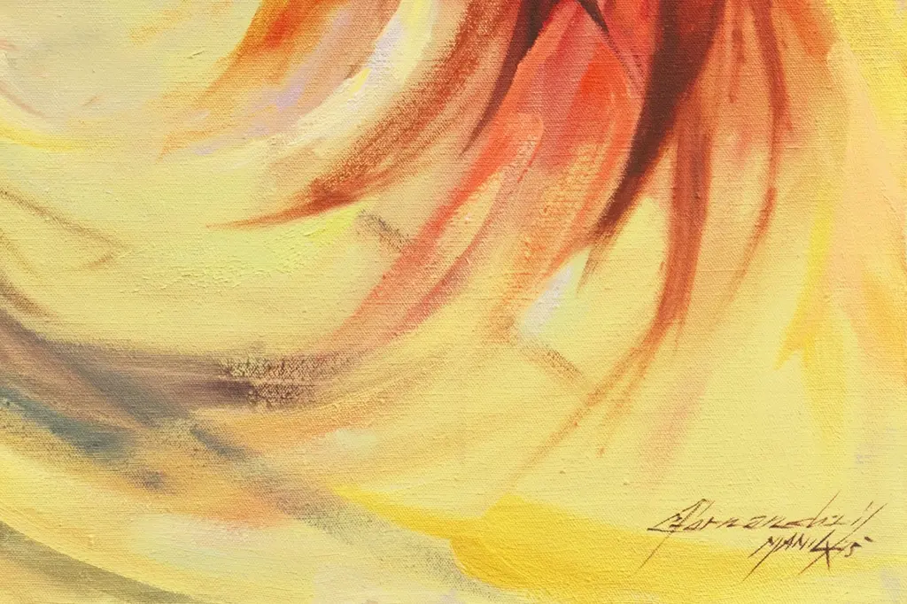 A substantial and period, action abstract showing concentric forms in coral and saffron over a variegated parchment ground. Signed lower right, 'G. Fernandez', titled, 'Mani' and dated April, 1975.