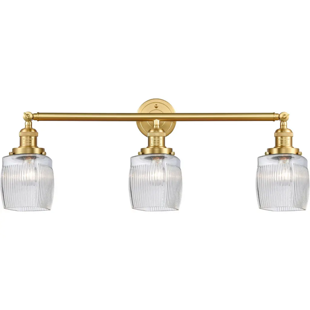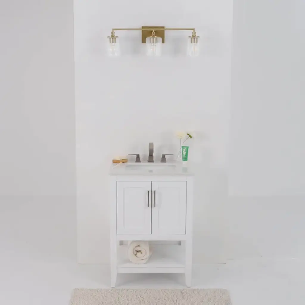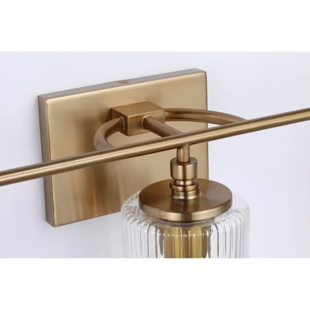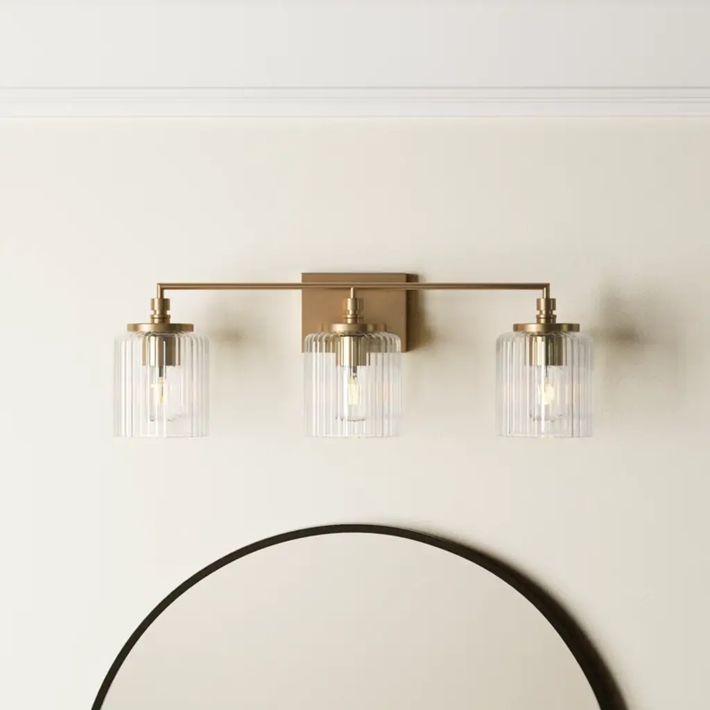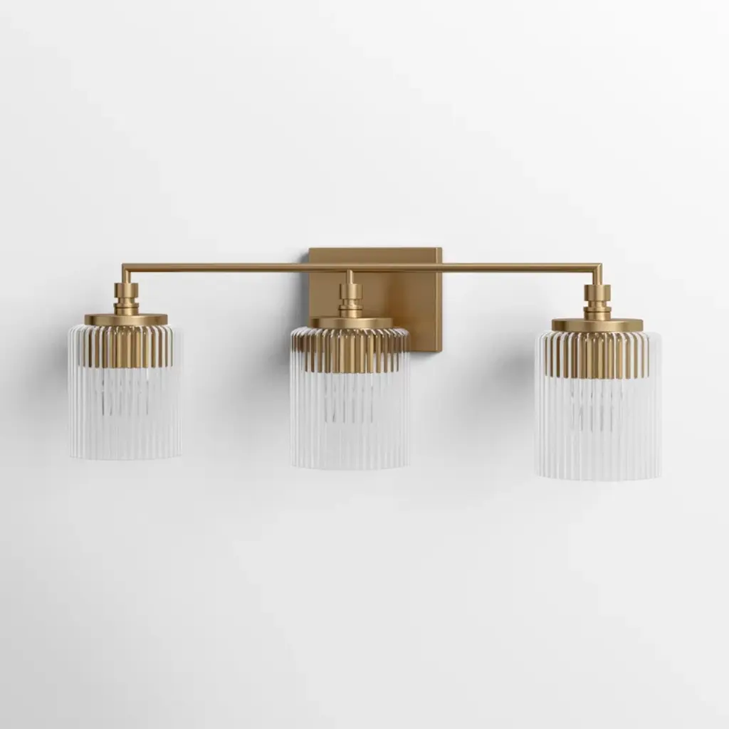 Elevate your bathroom with this 3-light vanity fixture, where clean lines meet subtle glamour. Its satin brass finish adds a touch of warmth to the modern frame, while the clear glass cylinders softly diffuse light, creating a welcoming ambiance. Designed for versatility, this fixture is dimmable, allowing you to adjust the brightness to suit your mood. Whether you're prepping for the day or winding down at night, this vanity light offers both functionality and style, making it a perfect addition to your space. Rated for damp locations.