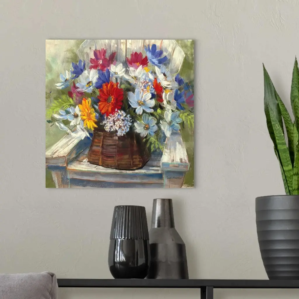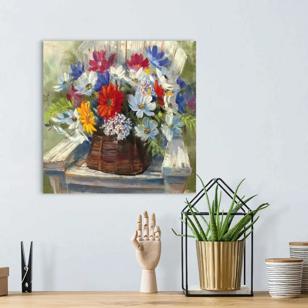 Contemporary painting of a basket of flowers sitting on wooden deck chair.