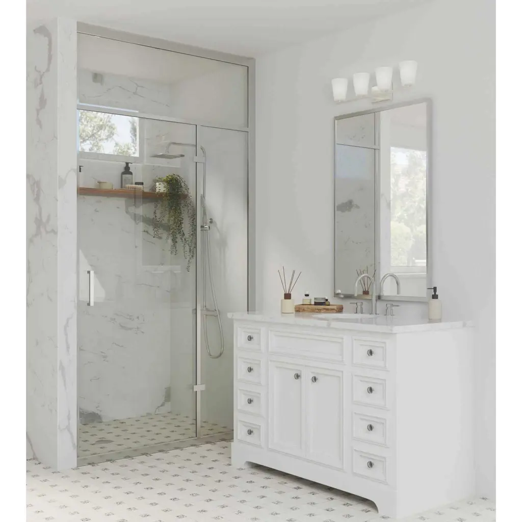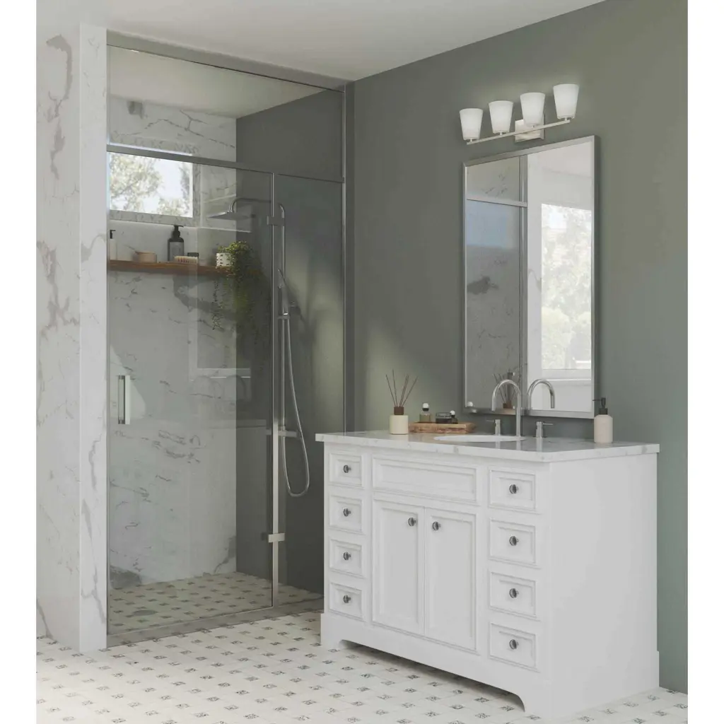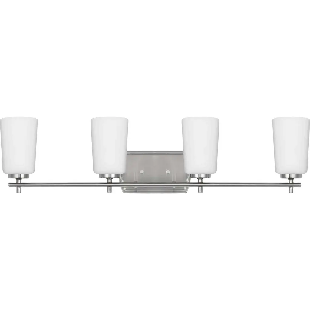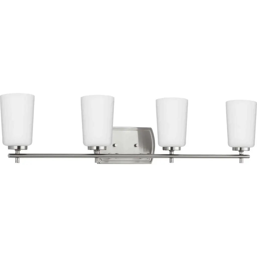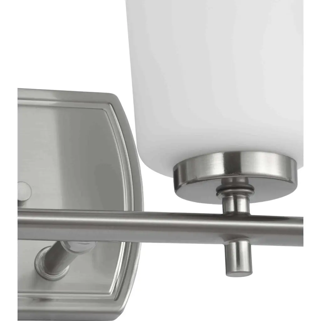 Fundamentally modern but with a traditional twist, the Adley vanity light combines opal glass shades with a curved edge backplate and a simple, straight bar finished in soft brushed nickel. This light is an elegant choice for illuminating new traditional and transitional settings.