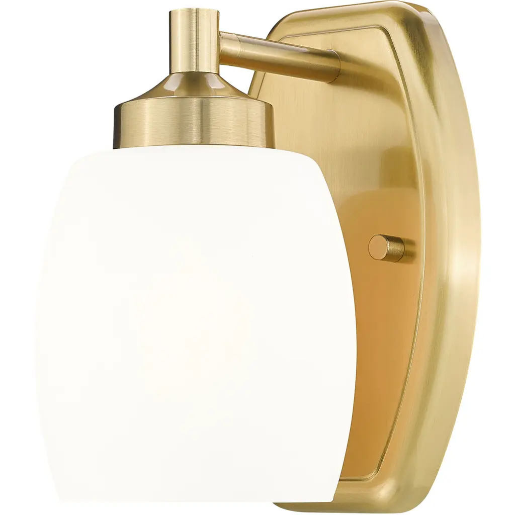 Fundamentally modern but with a traditional twist, the Adley vanity light combines an opal glass shade with a curved edge backplate and a simple, straight bar finished in lustrous satin brass. This light is an elegant choice for illuminating new traditional and transitional settings.