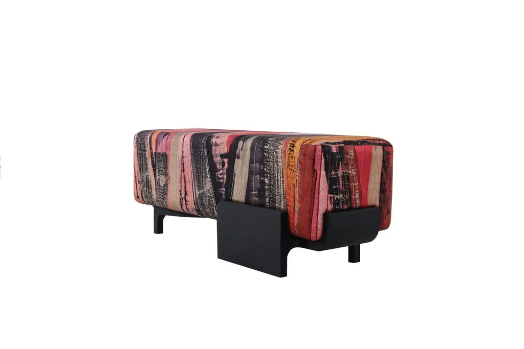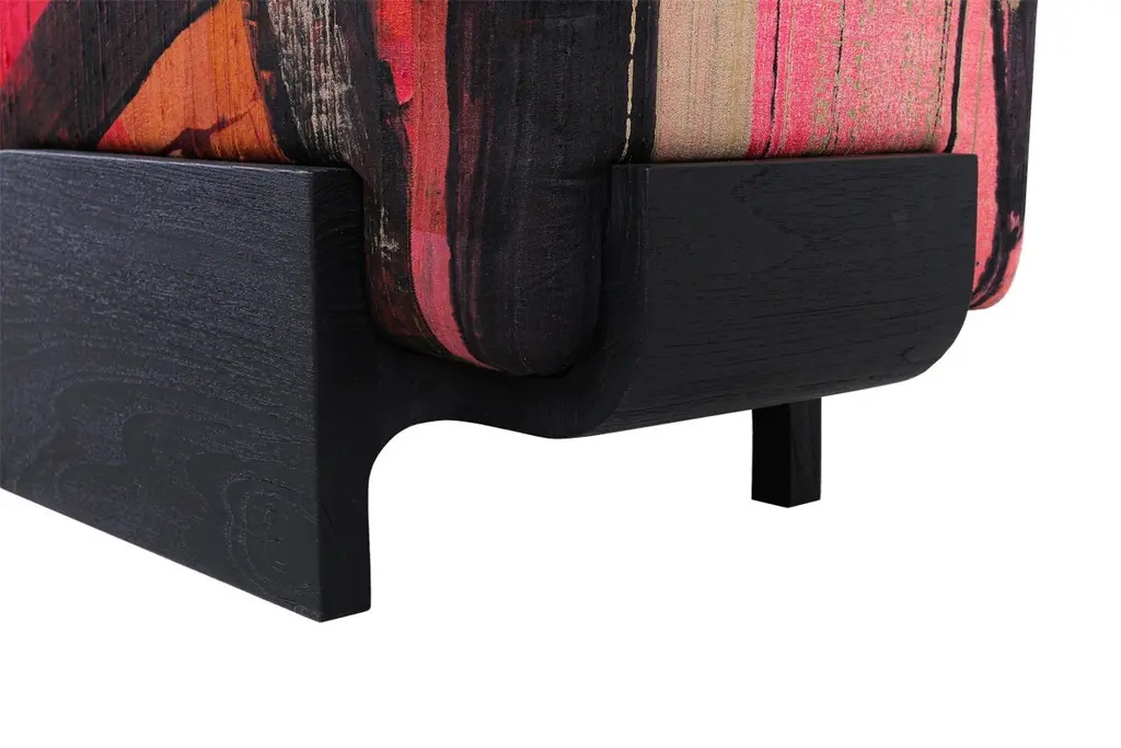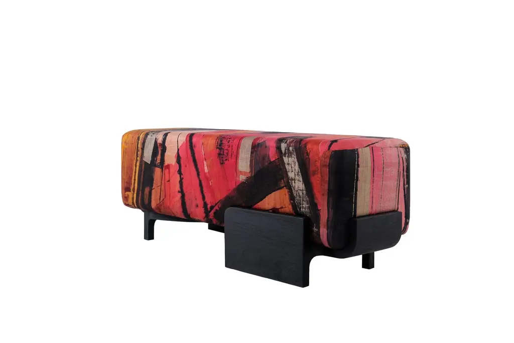 Admani Bench by PendhapaDimensions: D 126 x W 45 x H 42 cmMaterials: Solid black Javanese teak, Handloom Silk Weight: 60 kgThe vision behind our collaboration with Helena Bajaj Larsen is to merge and honor aesthetic and heritage standpoints hailing from diverse global perspectives. It is the coming together of an architectural design studio and a textile fashion studio. Our collaboration is anchored in space, touch, and interaction and manifests itself through both its structural and spatial qualities. Our first piece is intended as a physical object that would bring people together - a point of convergence in a circulatory space: a bench fit for a few individuals to gather, converse, and observe. We designed the bench as a central piece to dissolve the boundaries between product and architecture, fabric and surface, object and space. Pendhapa Atelier is here acting as the creative engineer behind the product's structure. Their design for the bench is conceived as “a plateau” to support and showcase the artwork and craftsmanship present in the fabric by HBL. The plateau is divided by two asymmetric arcs, making the bench experience different from each angle. The fabric is entirely hand-painted and is made of pure handloom Indian raw silk.We are Atelier Pendhapa, an architecture, furniture, and research design practice that seeks innovative forms rooted in timelessness.Based in Singapore, Jakarta, London, and Paris, Atelier Pendhapa has been engaged in projects across Europe and Southeast Asia since 2019. Founded by Antonin Hautefort and Ignatio Tenggara, Pendhapa seeks a holistic approach to the practice of architecture and aims to dissolve the boundaries between site, product, and architecture.Antonin and Ignatio founded Pendhapa Atelier together in 2019. While Antonin grew up in France, Ignatio comes from Indonesia. Their radically different cultural backgrounds and fascination with local craftsmanship motivated them to build an enterprise together.Both architects, by training, met at the Architectural Association in London while completing their master of Architecture. Prior to starting Pendhapa Atelier, Antonin and Ignatio worked for international architectural design practices on projects in the USA, the UK, France, South Africa, and Singapore.