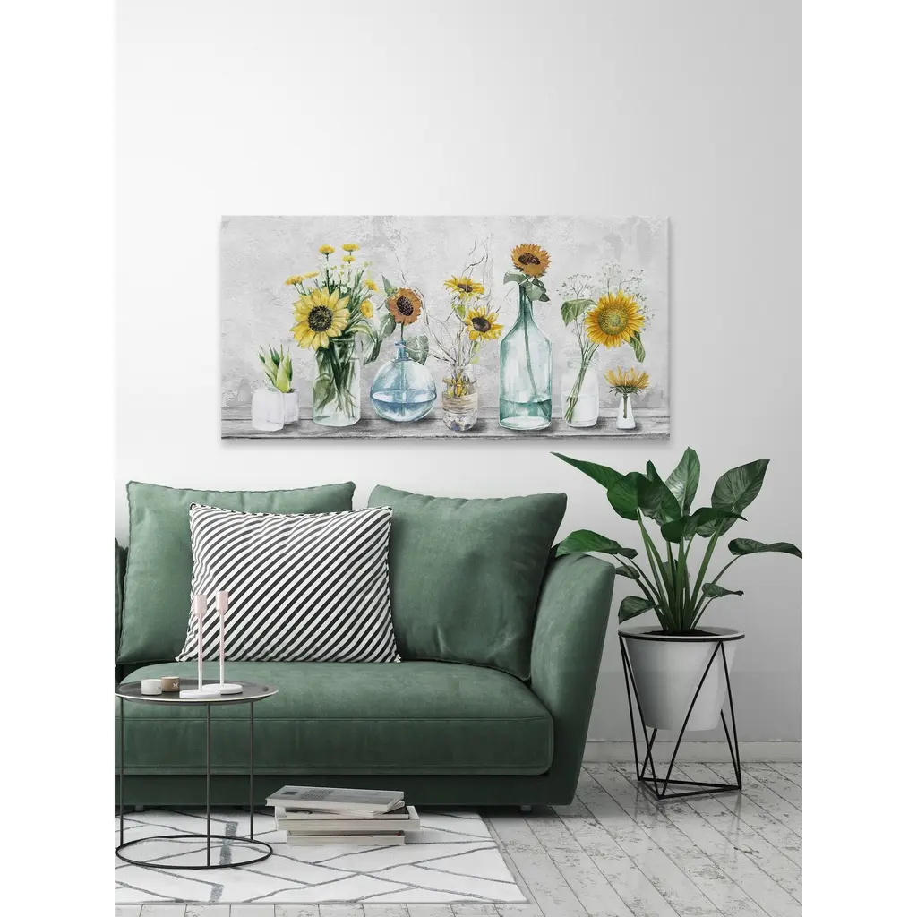Bright, naturally beautiful sunflowers turn their faces to the viewer, planted in clear bottles and jars that reflect light with the water within to light up this lovely acrylic print and bring some sun to any room. Proudly made in the USA, this piece is printed on canvas before it's stretched over non-warping wooden bars for a gallery-wrapped look. With wall-mounting hooks included, this artful accent is ready to hang up as soon as it reaches your front door. • Fine art canvas print from the Marmont Hill Art Collective • Professionally hand stretched • Gallery wrapped in sustainable, non-warping wood • Arrives ready to hang • Made in the USA • Includes a certificate of authenticity