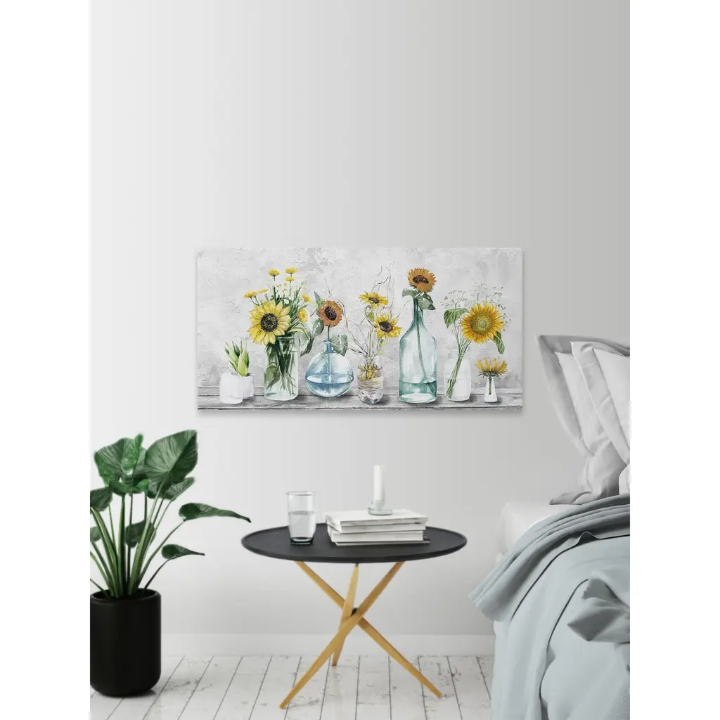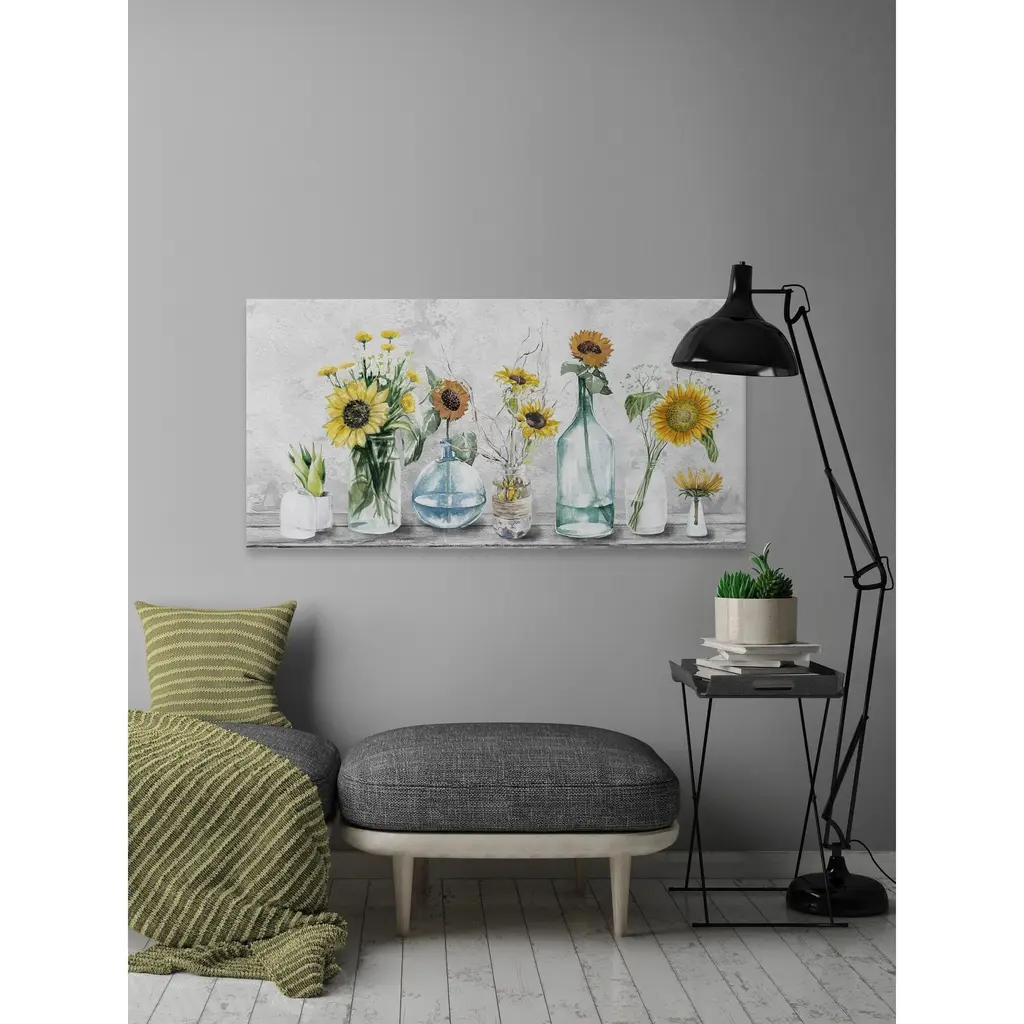 Bright, naturally beautiful sunflowers turn their faces to the viewer, planted in clear bottles and jars that reflect light with the water within to light up this lovely acrylic print and bring some sun to any room. Proudly made in the USA, this piece is printed on canvas before it's stretched over non-warping wooden bars for a gallery-wrapped look. With wall-mounting hooks included, this artful accent is ready to hang up as soon as it reaches your front door. • Fine art canvas print from the Marmont Hill Art Collective • Professionally hand stretched • Gallery wrapped in sustainable, non-warping wood • Arrives ready to hang • Made in the USA • Includes a certificate of authenticity