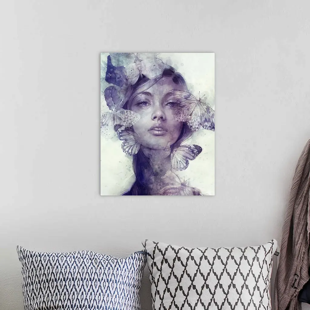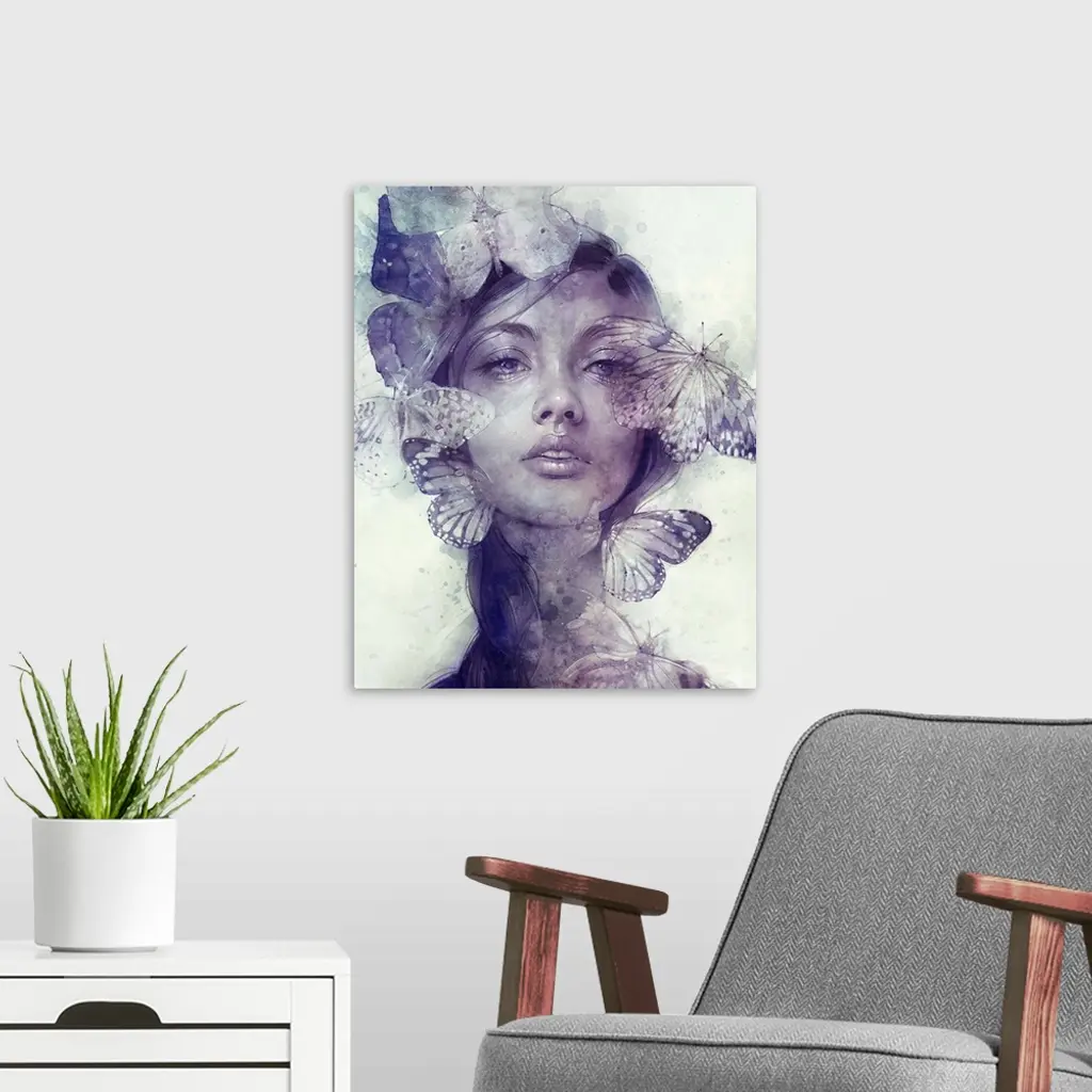 A contemporary painting of a portrait of a woman with her face surrounded by butterflies.