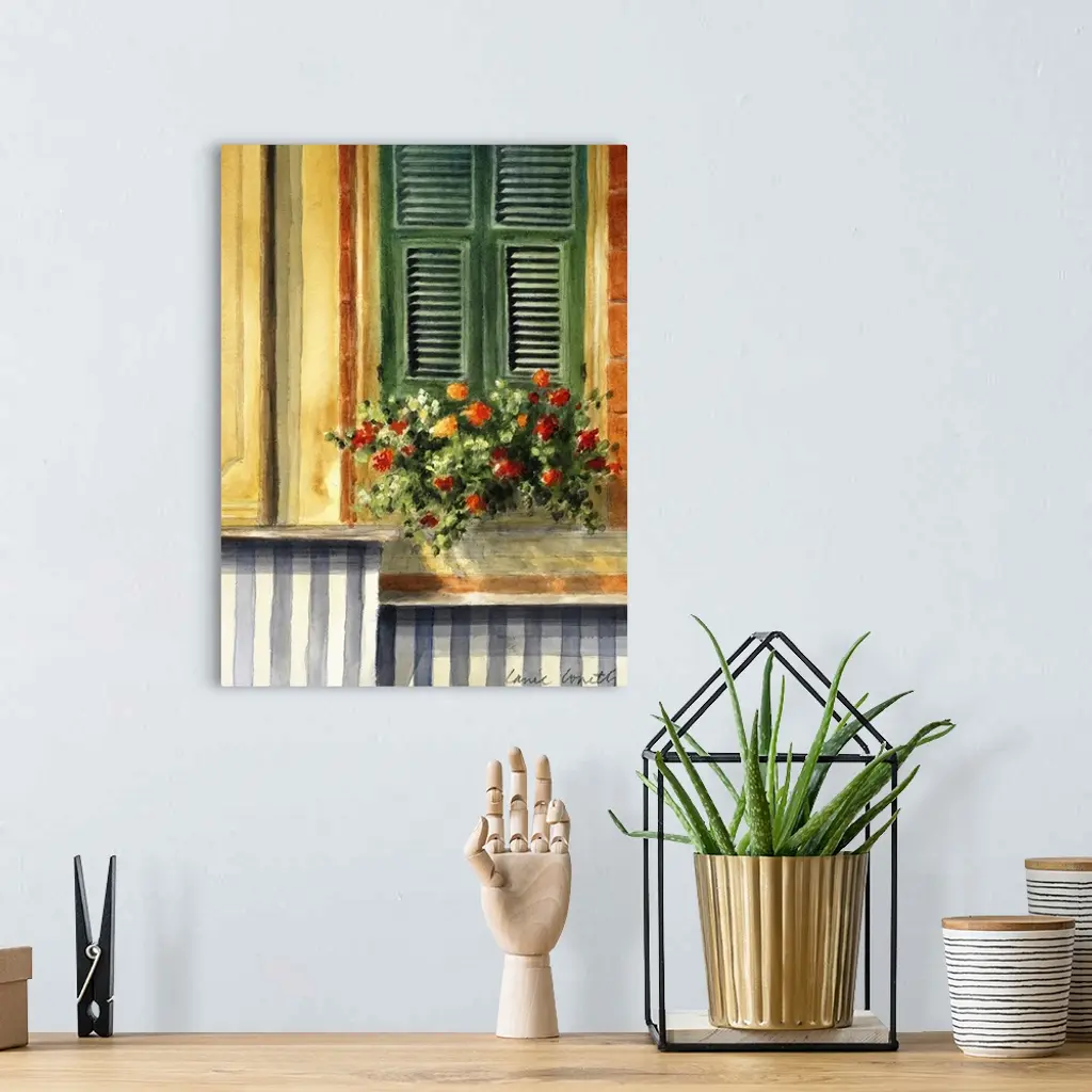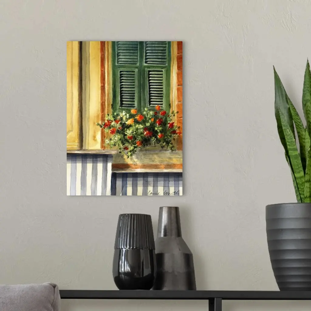 This home docor is a contemporary painting of a shuttered window with a small flower box at its base.