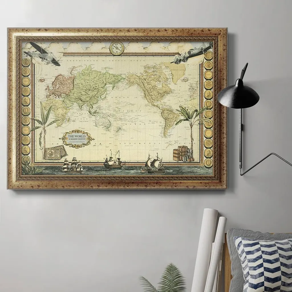 Adventure Map Premium Framed Canvas- Ready to Hang A Premium Framed Canvas created to last. Framed in distressed wood and available in an array of sizes and colors Featuring a beveled a solid wood stretcher bar, each piece comes ready to hand 3 SIZES AVAILABLE 16''X20'' - Overall Size 18'X27'' - Overall Size 24''x36'' - Overall Size Each piece is made to order. Each piece comes with hanging hardware. Made in the USA Ready to Hang Giclee Paper Print Acrylic Glass Beveled Matt Board
